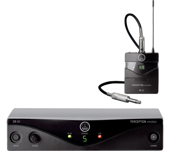 The Perception Wireless high performance Instrumental Set delivers brilliant sound for an exceptionally wide range of applications. The included PT45 body-pack transmitter is the smallest and lightest transmitter in its class. It provides a professional three-pin mini XLR connector and can be used with the included guitar cable or one of the