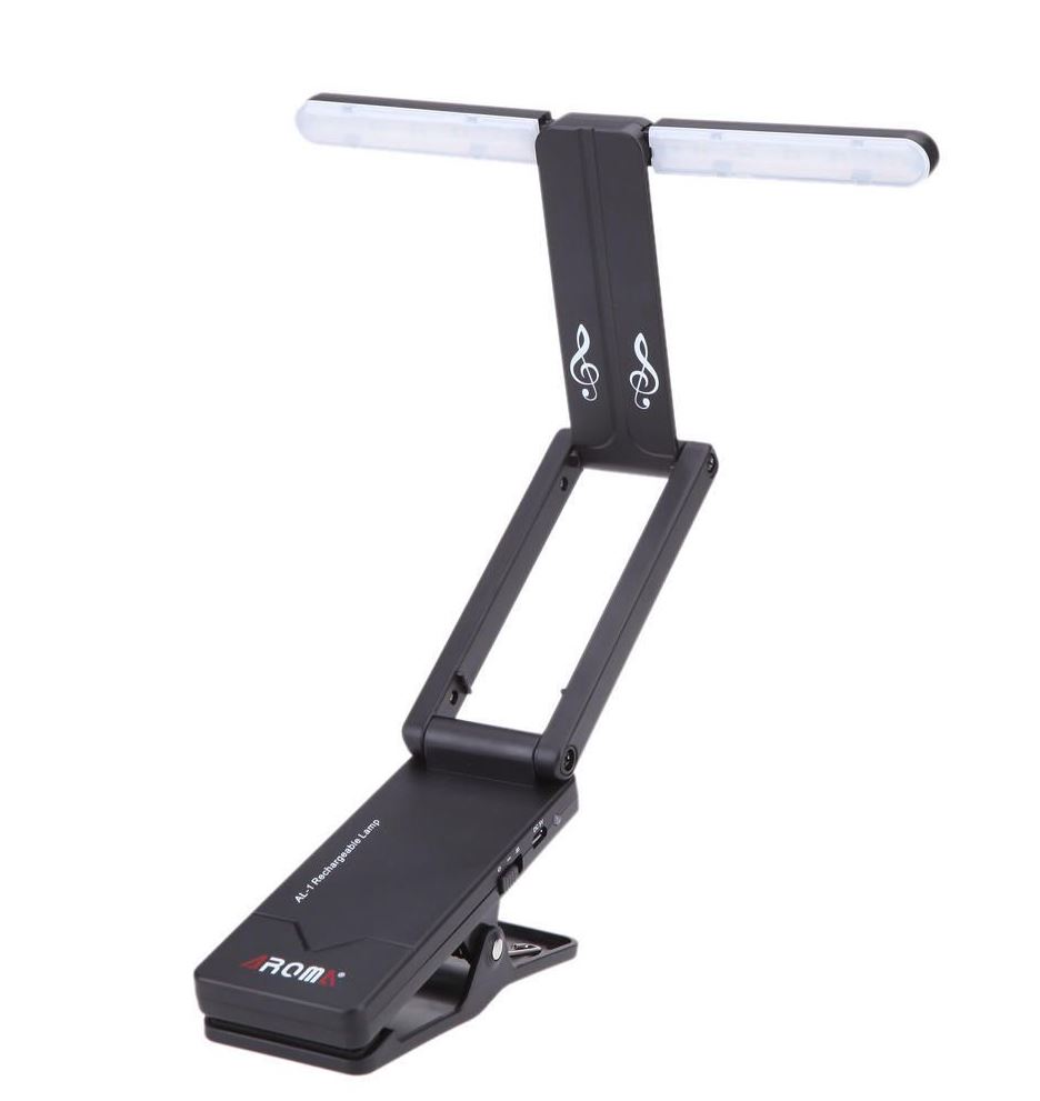 Aroma AL-1 Stand Lamp ladattava nuottivalo Leveästi kirkkaan valon (LED) antava, pianon päälle tai nuottitelineeseen kiinnitettävä valaisin toimii yhdellä latauksella jopa 6 tuntia. 10 LED-polttimoa Kokoontaittuva ja helposti mukana kuljetettava USB-jlatausjohto mukana. Mahdollista käyttää myös erikseen myytävän ( Zoom AD-17E ) virtalähteen kanssa. Paino 154 g