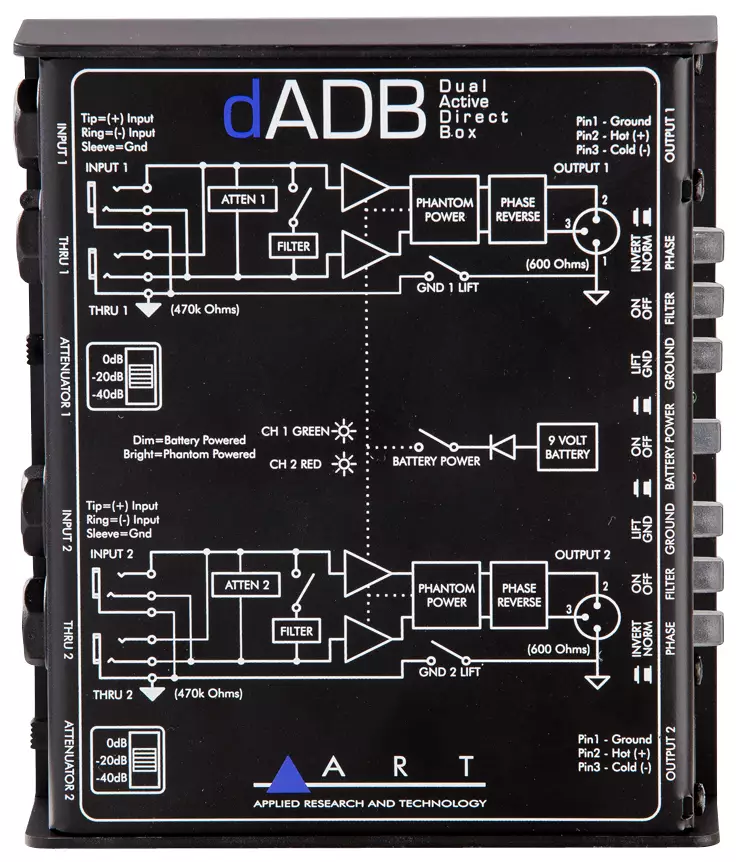 ART dADB -kaksoisaktiivinen DI-boksi toimii kahtena itsenäisenä, korkealaatuisena aktiiviliitäntänä instrumentti-, linja- tai kaiutinsignaalien kytkemiseen balansoituihin tuloihin. Korkean impedanssin ¼ tuuman tulot puskuroidaan ja muunnetaan erittäin vähäkohinaisella aktiivielektroniikalla, jolloin saadaan eristettyjä, balansoituja ja matalan impedanssin lähtöjä.