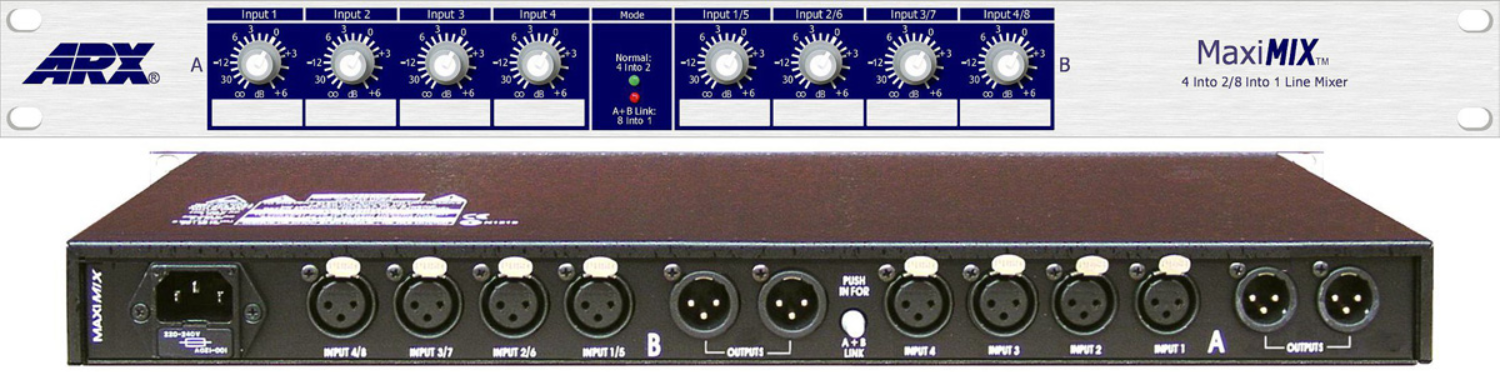 Esittelyssä ARX:n MaxiMIX: Kaksi itsenäistä sekoitusryhmää, joista kukin koostuu 4 linjatulosta, joissa on yksilölliset tasonsäätimet ja RF-suodattimet. Molemmat ryhmät voidaan linkittää Mono 8 -kanavasekoitukseksi.