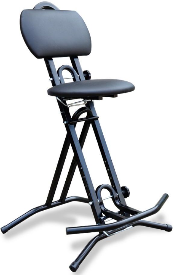 Comfortable and stable chair for a guitar player with multistage regulation of footstool and seat. The folding option considerably facilitates transport. Extras: possibility of a guitar handle installation.