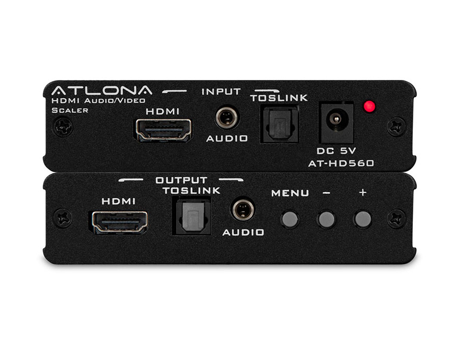 The Atlona AT-HD560 is an advanced HDMI to HDMI Scaler. It accepts HDMI input with a separate Toslink or analog audio and scales it to a HDMI output (at a number of selectable resolutions) with additional Toslink and analog audio output. Any HDMI input resolution could be up-converted up to 1080p or down-converted as well to any resolution (listed in the technical specifications). The AT-HD560 is also a perfect solution for converting 50Hz to 60Hz or 60Hz to 50Hz, this feature will allow you to connect HDMI video source from a PAL format region to a NTSC region, for example, a European HD source to a USA TV with HDMI input.