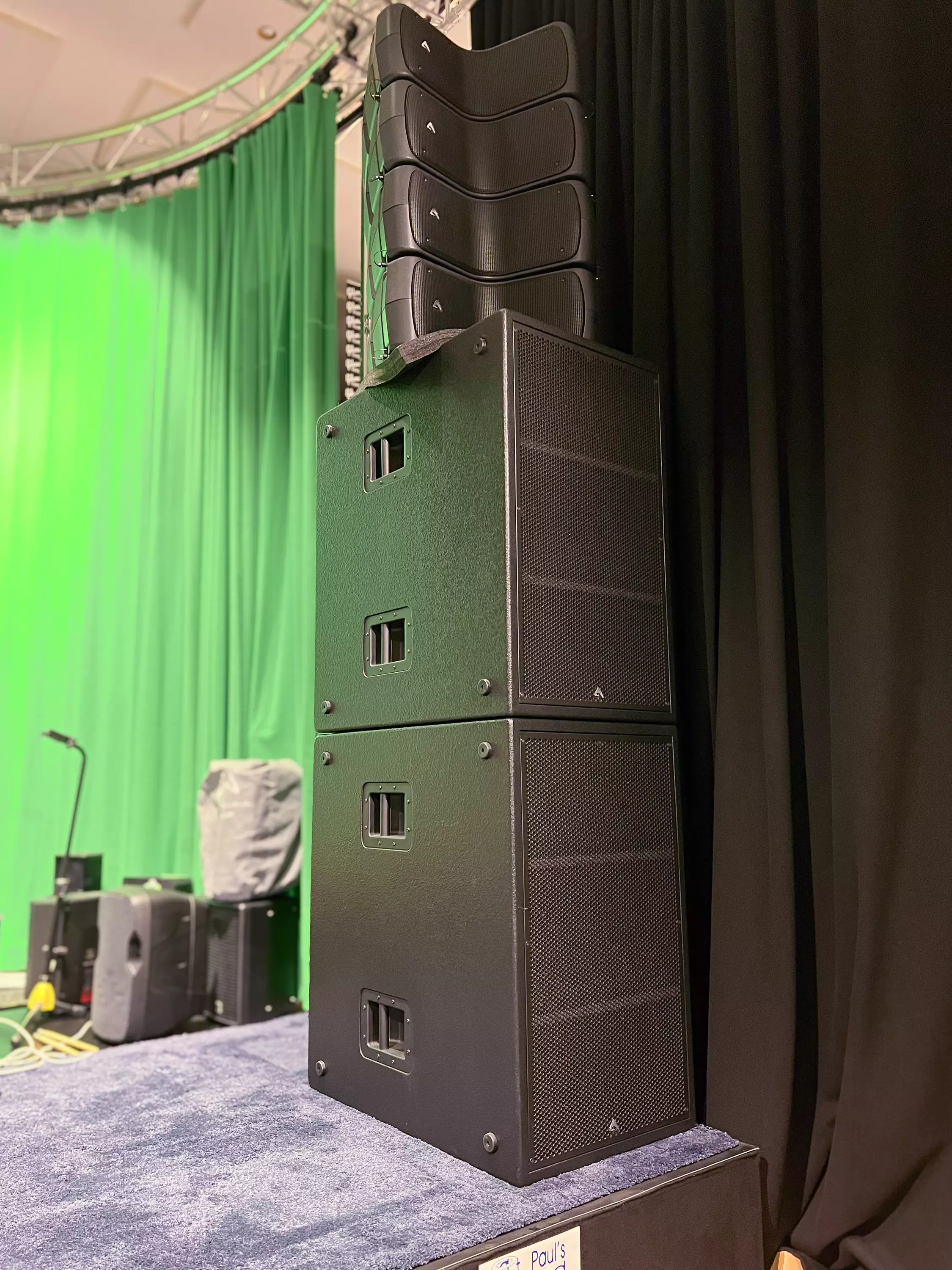 - Järeä Pro-tason aktiivinen PA-järjestelmä neljällä Line Array -aktiivikaiuttimella ja kahdella tupla-18" aktiivisubwooferilla audio- ja PowerCon-virtakaapeleineen