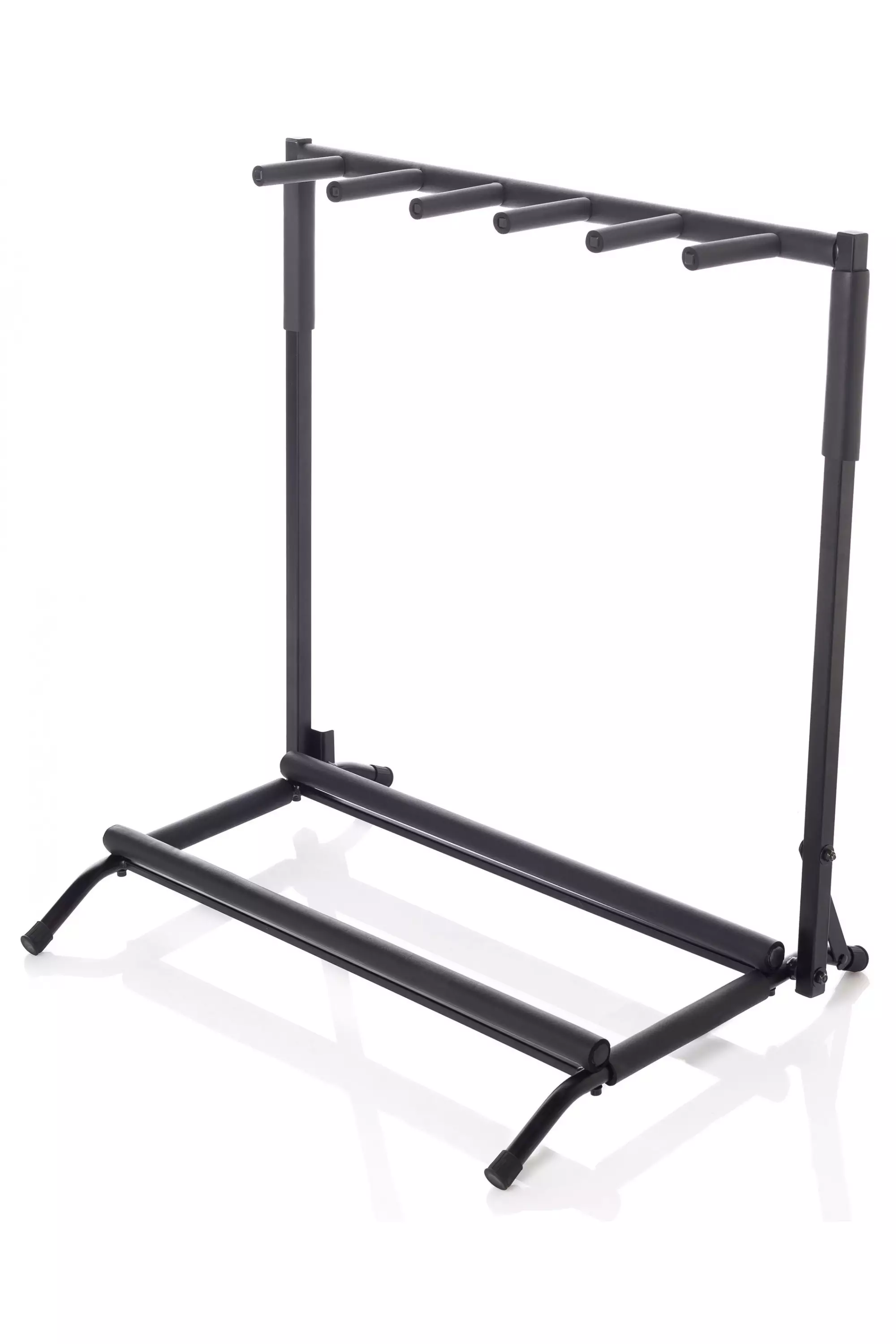 Näppärä ja kasaantaittuva teline viidelle kitaralle tai bassolle soittimia suojaavalla pinnalla.