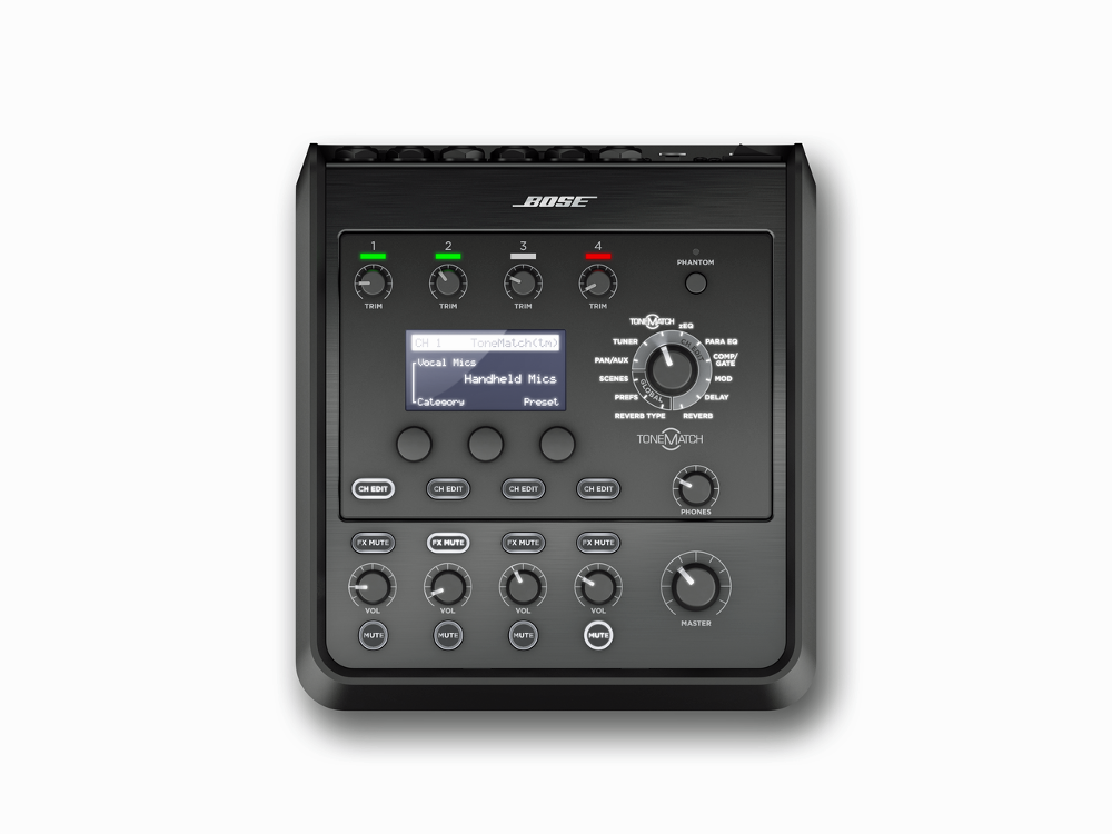 Uusi Bose T4S ToneMatch® digitaalimikseri, joka on suunniteltu käytettäväksi Bose® L1®- ja Bose® F1® äänijärjestelmien kanssa. Ainutlaatuisen ToneMatch- esiasetusten avulla voidaan optimoida kaikki soittimet ja mikrofonit yhdellä kosketuksella. Mikserissä on neljä itsenäistä kanavaa, joihin voidaan esiohjelmoida älykäs EQ-toiminto sekä studioluokan tehosteita ja ääniprosessoreja.