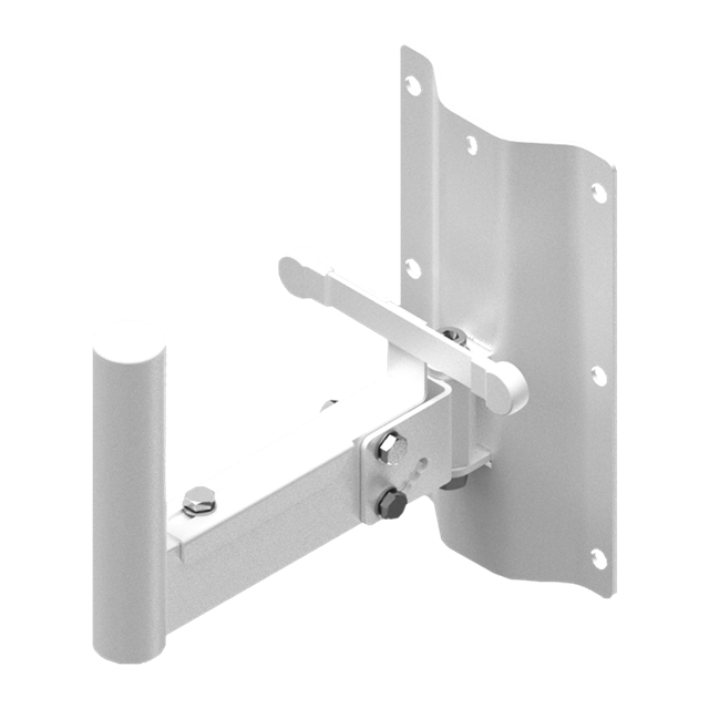 Valkoinen lyhytvartinen teräksinen seinäteline PA-kaiuttimelle 35 mm tolppalla. Kantavuus 40 kg, säädettävä kallistuskulma.