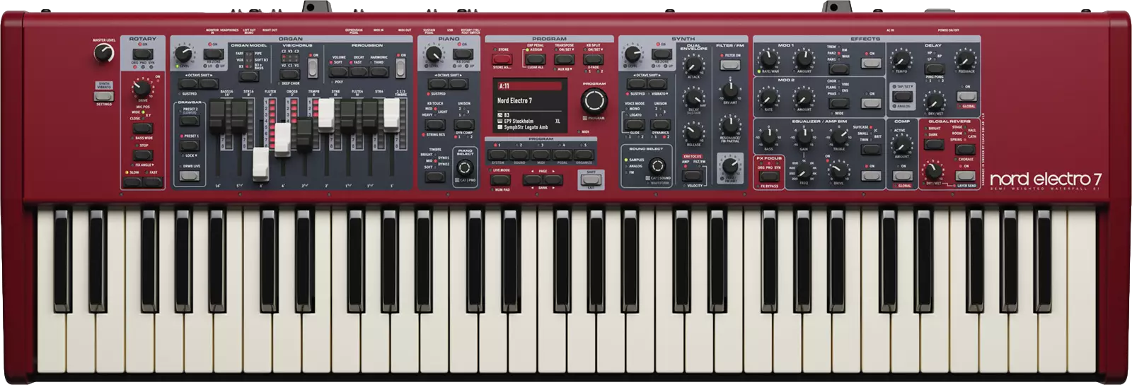 Nord Electro 7 nostaa Electro-sarjan uudelle tasolle tehokkaalla uudella syntetisaattoriosiolla, omilla osiokohtaisilla efekteillä ja hienostuneella paneelisuunnittelulla sekä korkearesoluutioisella värinäytöllä. Yhdistämällä uusimmat piano-ominaisuutemme ylistetyn Nord Organ 3:n urkuihin ja pyörivään kaiuttimeen, Nord Electro 7 tarjoaa poikkeuksellisen monipuolisuuden kevyessä ja lavavalmiissa soittimessa.