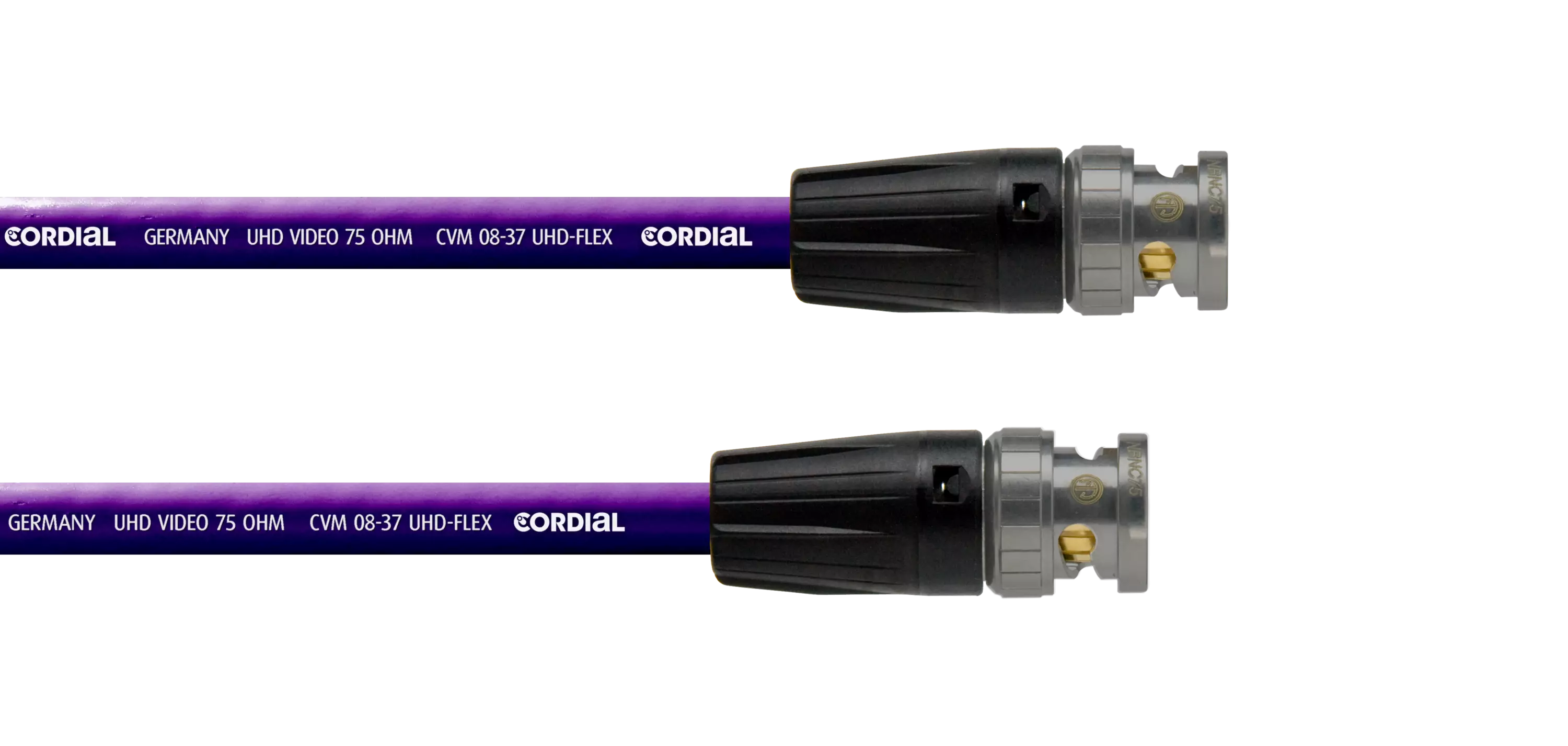 Taipuisa tuplasuojattu Cordial CVPBB UHD-SDI videokaapeli Neutrikin rearTWIST BNC-liittimillä.