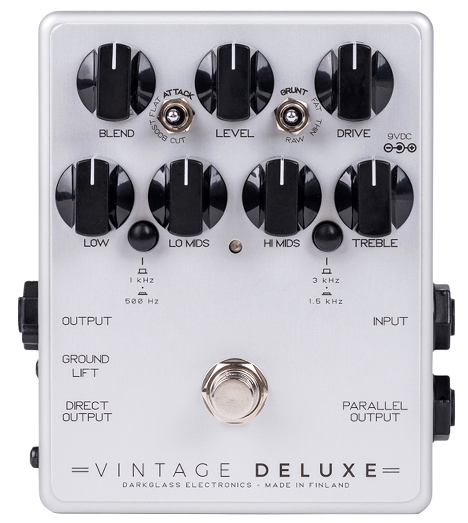 Uusittu Darkglass Vintage Deluxe kumartaa hieman aikaisempaa versiota syvemmin klassikoksi muodostuneen Microtubes B7K-pedaalin suuntaan. Era-nuppi on poistunut historiaan ja EQ on saanut kaksi eri keskialueen taajuutta hallitakseen. Laitteesta löytyy myös kaksi uutta minikytkintä: Grunt ja Attack. Grunt valitsee kuinka paljon alataajuudet säröytyvät kun Attack-kytkin taas määrittelee signaalin diskanttiosion säröytymisen. Direct output -ulostulon ansiosta laite toimii myös DI-boksina. Normaalin ulostulon lisäksi Vintage Deluxen kyljessä on myös parallel output joka päästää puhtaan, pedaaliin sisään menevän signaalin läpi sellaisenaan. Vintage Deluxe on pikkuveljensä lailla uskomaton läpileikkaus menneiden vuosikymmenten muhkeita putkisäröjä, jotka ovat nyt entistäkin monikäyttöisempiä Vintage Deluxen EQ-säätöjen sekä moninaisten ulostulojen ansiosta.