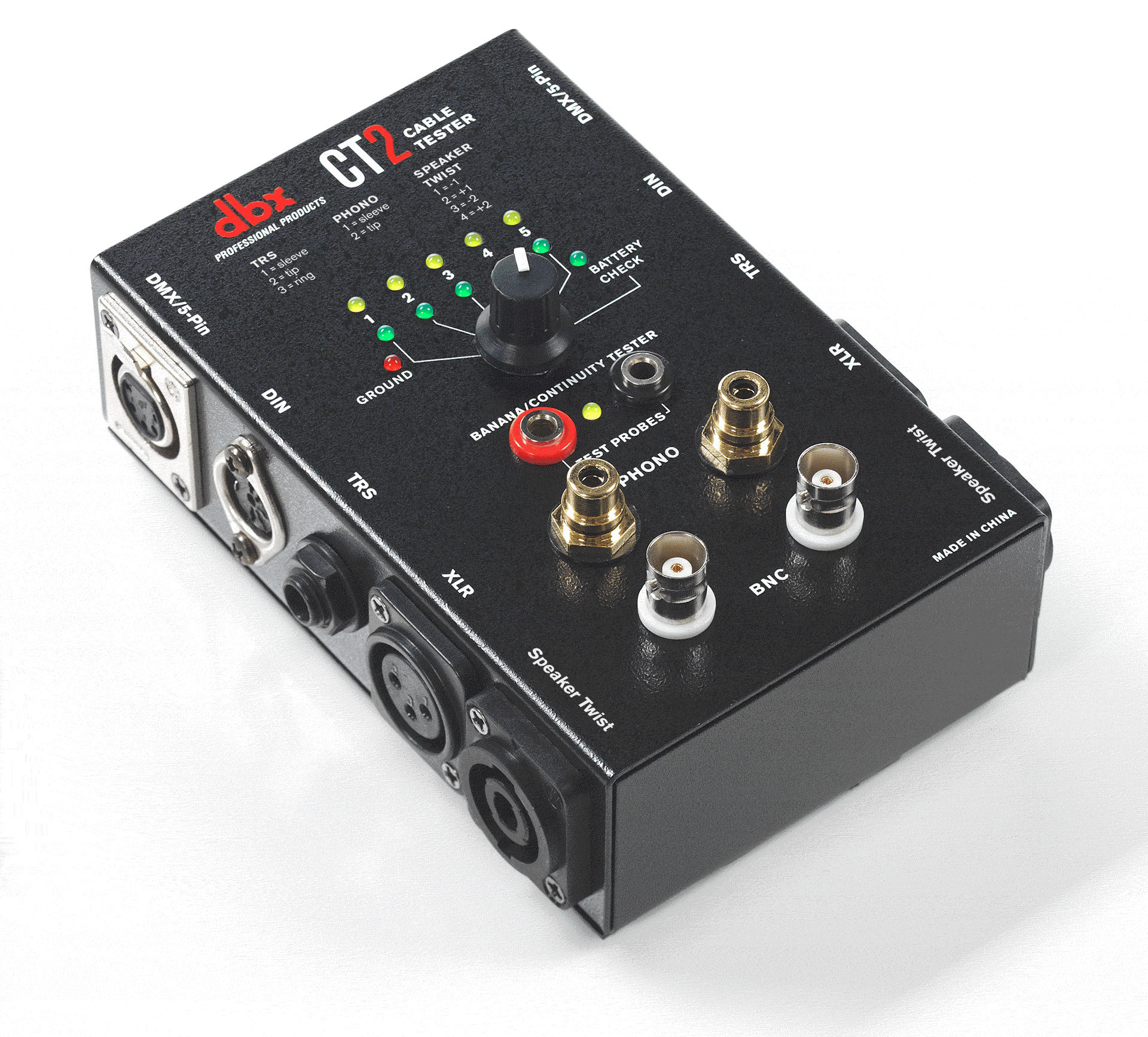 DBX CT2 -testerillä voi kätevästi tarkistaa monenlaisten kaapeleiden kunnon. CT-2 tarjoaa yleisimmät liitintyypit, joiden joukossa ovat Speakon, XLR, RCA, BNC, DIN sekä mono- ja TRS-jakit ynnä DMX ja banaani.