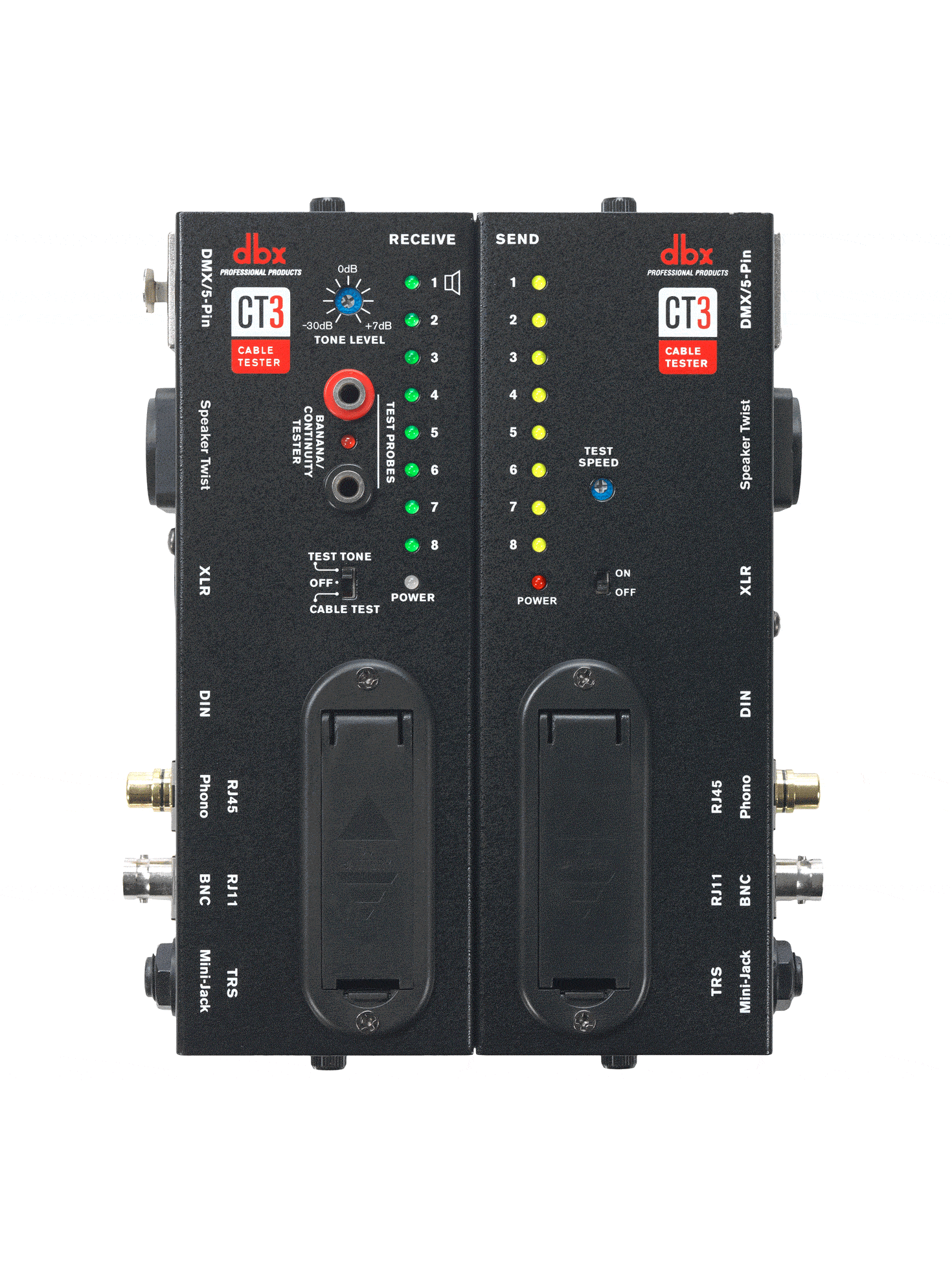 DBX CT3 on vaativaan käyttöön suunniteltu testeri, jolla voi helposti tutkia hyvin monenlaisten kaapeleiden kunnon. CT3 tarjoaa useita tyypillisiä liitäntöjä, joiden joukossa ovat RJ45, RJ11, MIDI, Speakon, XLR, RCA, BNC, DIN, TRS, TS, DMX, sekä banaani.