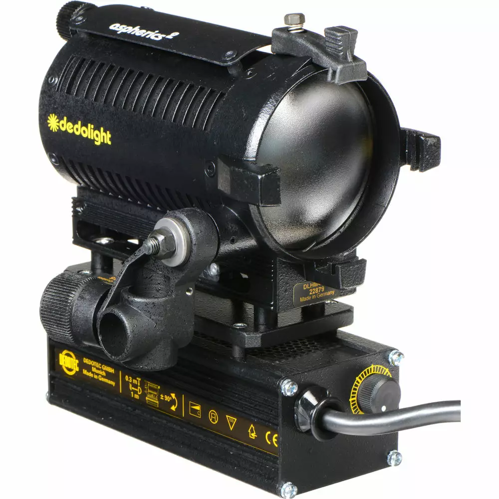 The Dedolight DLHM4300U is a self-contained 150 watt, 120 volt tungsten-halogen fixture that works with a built-in electronic transformer dimmer. Using 24V, 150W lamps powered directly from an AC power source, this version of the Dedolight head offers a color temperature of 3000°K.