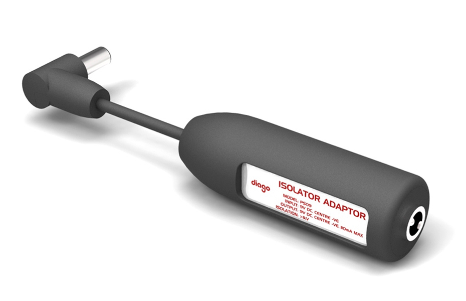 Diago PS09 Isolator Adaptor. Häiriön suodatin, joka poistaa häiriöt, joita syntyy usein kun signaaliketjuun kytketään sekaisin digitaalisia ja analogisia pedaalaje. Kannattaa kokeilla myös muihin ongelmatilanteisiin häiriöiden ilmaantuessa .