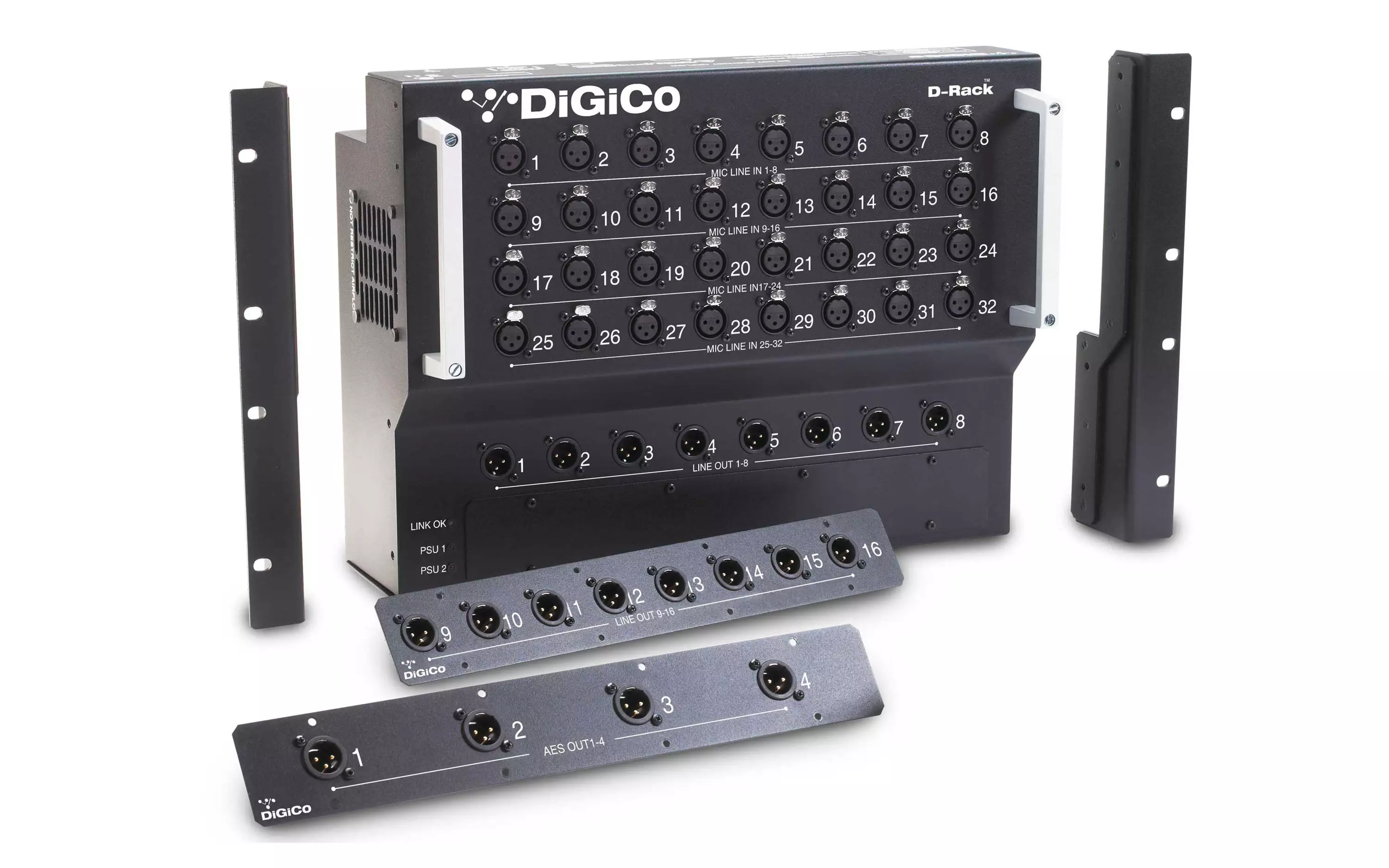 Providing 32 microphone inputs, 8 line outputs and 8 optional modular outputs that can be selected as either analogue or AES, the D-Rack provides a maximum capacity of 32 ins and 16 outs at 48kHz. The hum and noise of analogue multicores are eliminated courtesy of a digital Cat5e connection to the console work surface. When running at 96kHz on Cat5e, the D-Rack supports 28 mic inputs and up to 16 outputs.