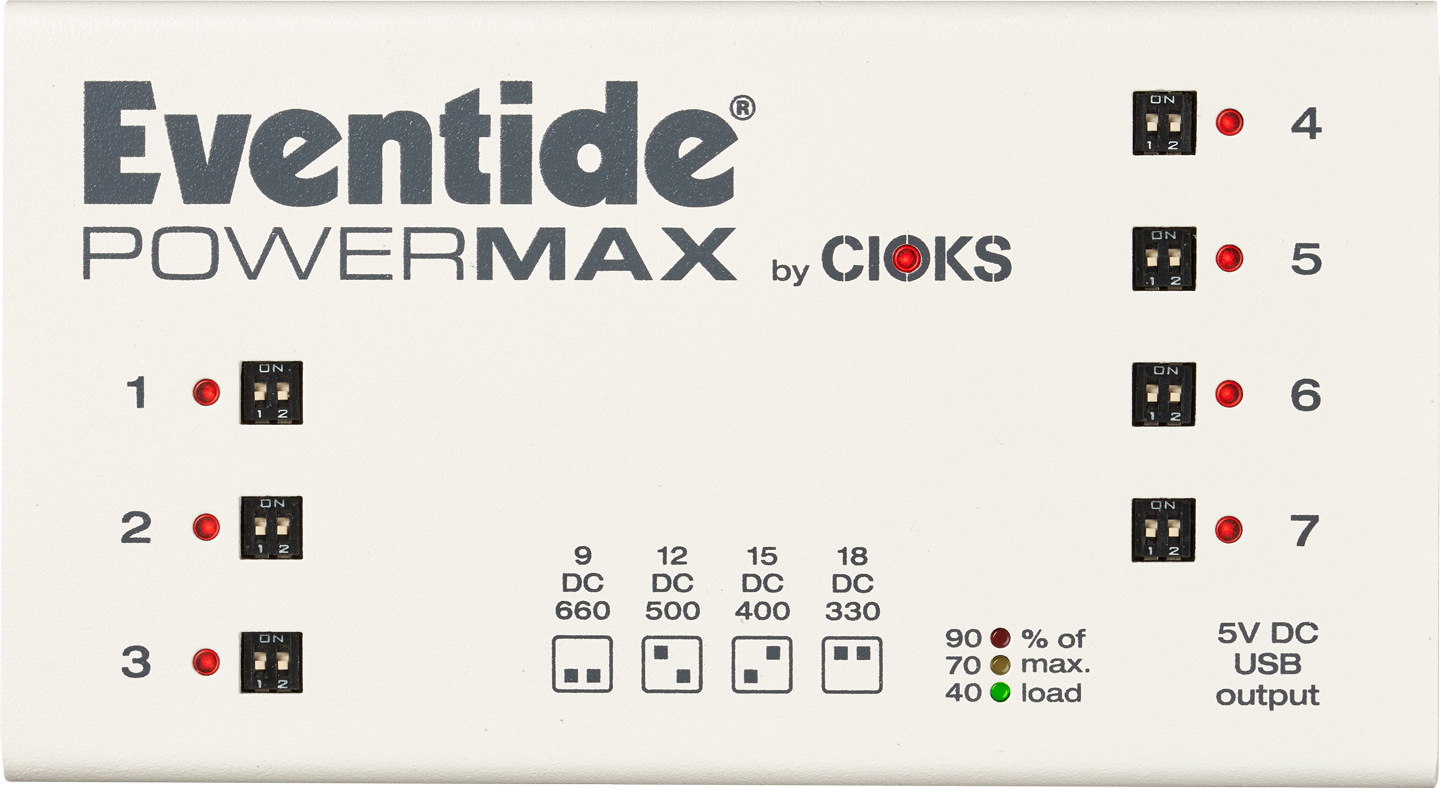 Eventide PowerMax virtalähde Ominaisuudet: 7 isolated outlets, each offering voltages 9, 12, 15 or 18V High current 660mA @ 9V on all 7 Powers multiple Eventide, Strymon or other high current pedals... Lue lisää