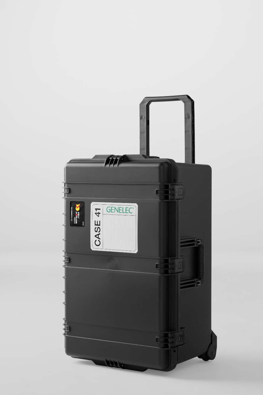 The case comes with easy-open double throw latches for fast and easy access. A rubber over-moulded handle, a rugged extendable handle, and four strong polyurethane wheels provide extreme carrying comfort. The foam insert is custom-made in Finland to ensure the perfect fit and the best possible protection for your Genelec speakers. All Peli cases come with a limited life-time warranty. Available in matte black color.