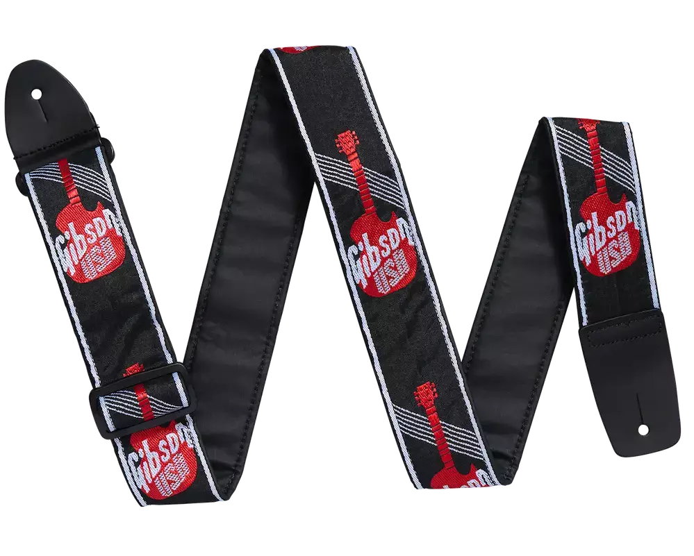 Korkealaatuinen, 5 cm leveä kudottu kitarahihna on koristeltu vintage-tyylisillä Gibson USA -logoilla, jotka on sijoitettu Les Paul Standard -kitaran ajattoman siluetin päälle.