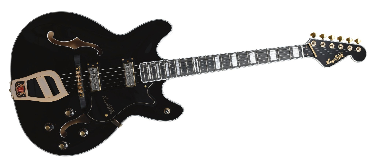 67’ Viking II Edition - Body: Hollow Double Cutaway, 5-Ply Canadian Flame Maple Ply - Neck: Bolt-On, Canadian Hard Maple - Fingerboard: Resinator Wood with Pearloid block inlays - Frets: 22 Medium Jumbo / 15" Radius - Nut: GraphTech Black Tusq XL Nut / 43mm - Truss Rod: H-Expander - Tuning Keys: Hagstrom 18:1 Chrome Die Cast Tuners - Gold Finish - Scale Length: 24.56 (624mm)" - Pickups: 2 x Hagstrom H-52 AlNiCo 5 Gold Mini Humbucker Pickups w/ coil split - Pickup Selector: 3-Way Toggle Switch Pickup Selector - Gold Finish - Bridge: Long Throw Tune-O-Matic Bridge on wood blockwith Hagstrom Trapeeze Tail Piece - Gold Finish - Controls: 2 x Volume Control / 2 x Tone Control (Push/Pull) - Color: Black Gloss