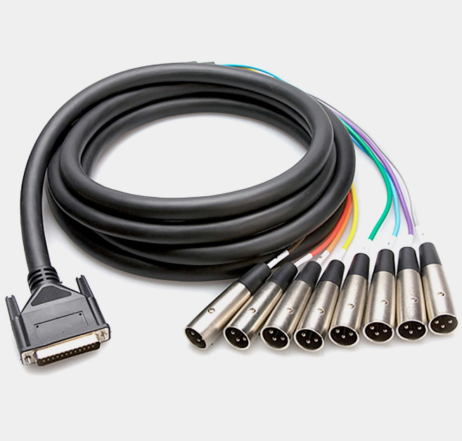 25-pin male plug (also called a D-Sub) wired-out to 8 XLR Male connectors, for output.