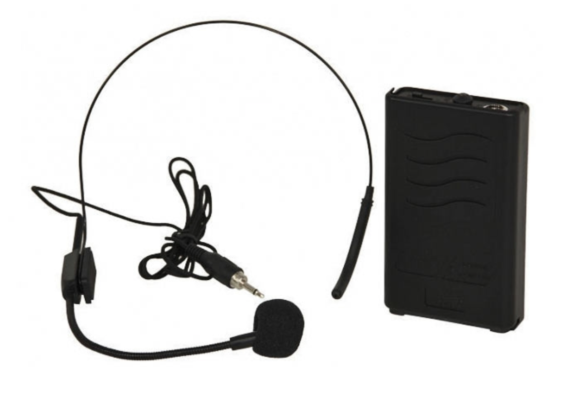Headset-mikrofonisetti, joka koostuu langattomasta vyölähettimestä ja pääpantamikrofonista. UHF-taajuusikkuna.