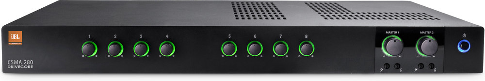 The JBL® CSMA series of Mixer-Amplifiers are a professional tool with a sleek industrial look that is designed and built for commercial sound applications. Utilizing Crown’s DriveCore technology enables significantly reduced size and weight – all mixer/amps are highly efficient, fanless and just 1U rack space high. There are both single channel and two channel models with four or eight mixer channels, respectively.