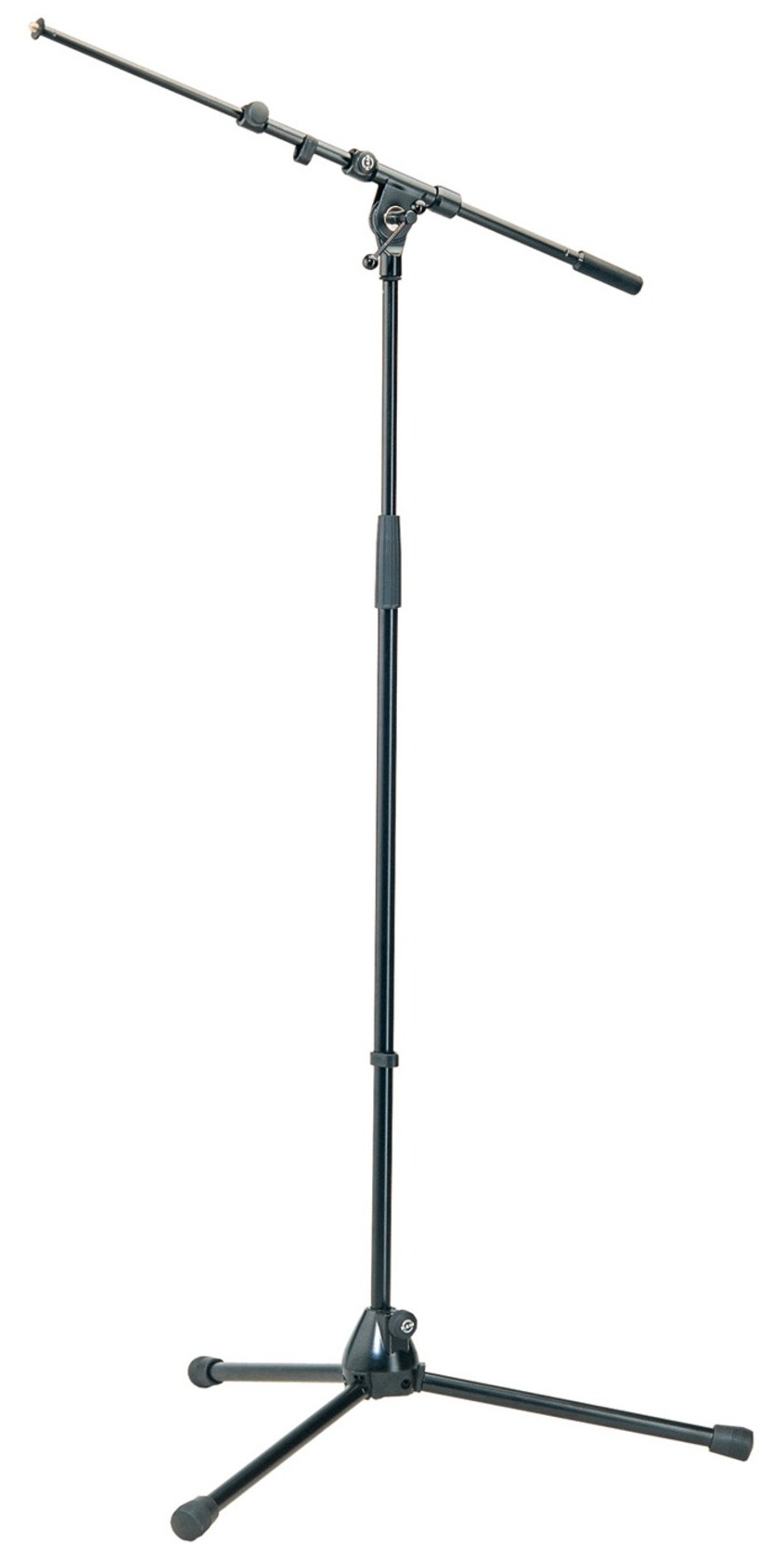 Teleskooppipuomilla varustettu mikrofonijalusta. Tukeva ja kestävä rakenne. Valurautaa. Taittuva, pitkät jalat.
