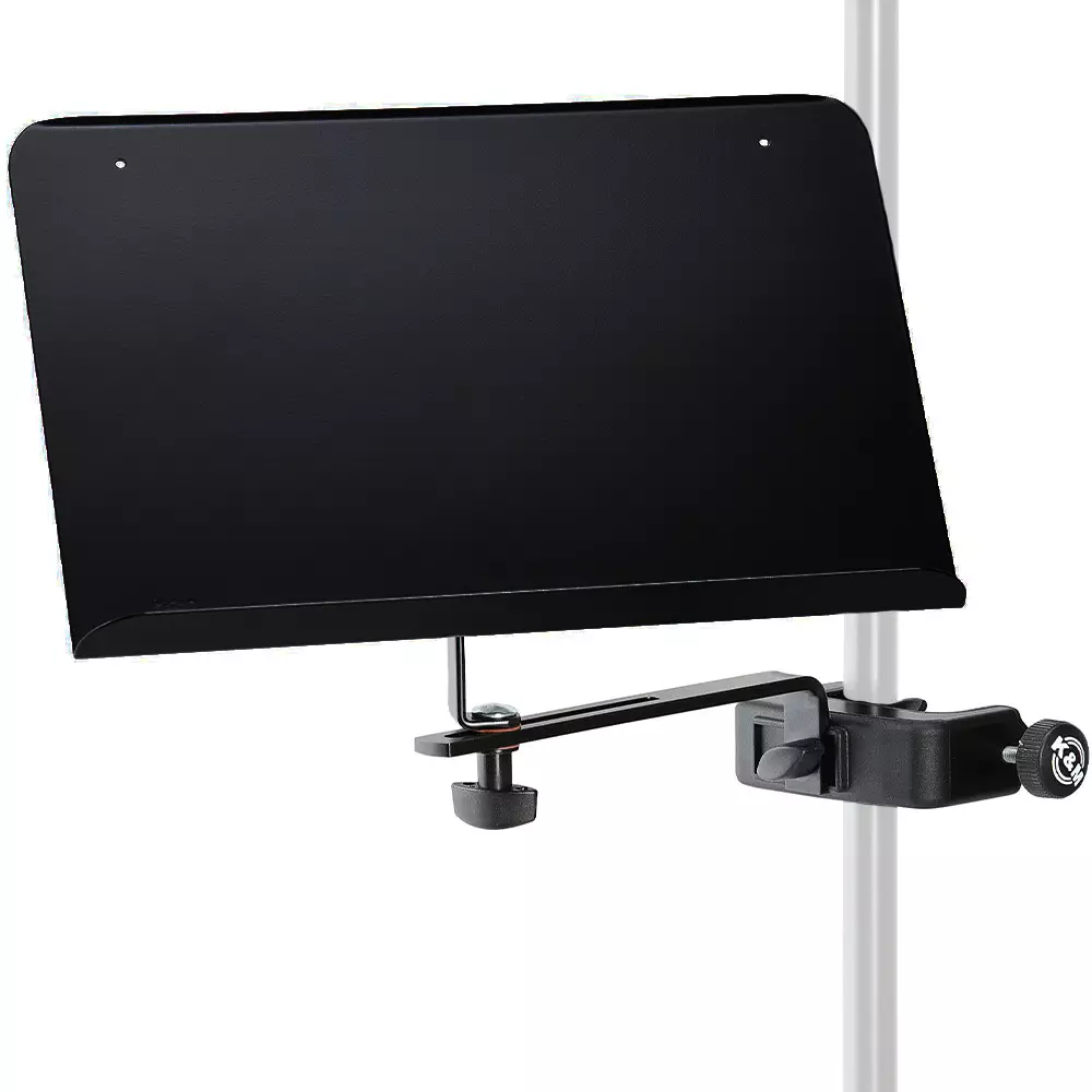 Kompakti nuottitaso, jonka voit kiinnittää telineen jalustaputkeen tai pöytätasoon. Kallistettavan nuottitason katselukulmaa ja syvyyttä suhteessa jalustaputkeen voidaan säätää. Joustava puristinkiinnike mahdollistaa pidikkeen helpon kiinnittämisen moniin eri suuntiin. Puristin voidaan kiinnittää pöytätasoon, jonka paksuus on 0mm–48 mm. Puristimen tukeva metallirunko on varustettu korkealaatuisilla muoviosilla, ja liukumaton pinnoite varmistaa turvallisen ja voimakkaan pidon.