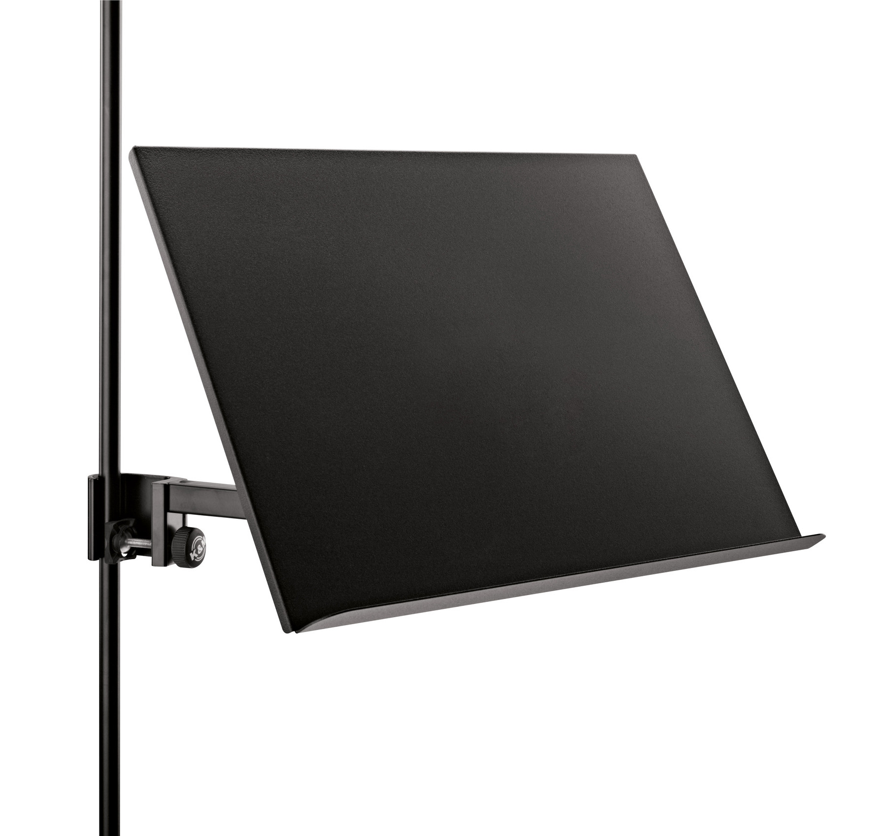 Torsion-resistant sheet music holder in steel with integrated K&M logo. High-class, easy-to-use aluminum clamping element with protective plastic inserts, attaches to tubes with diameter up to 30 mm. Tiltable music holder is infinitely adjustable in height and angle. Music desk depth 30 mm. Folds very small, easy to carry.