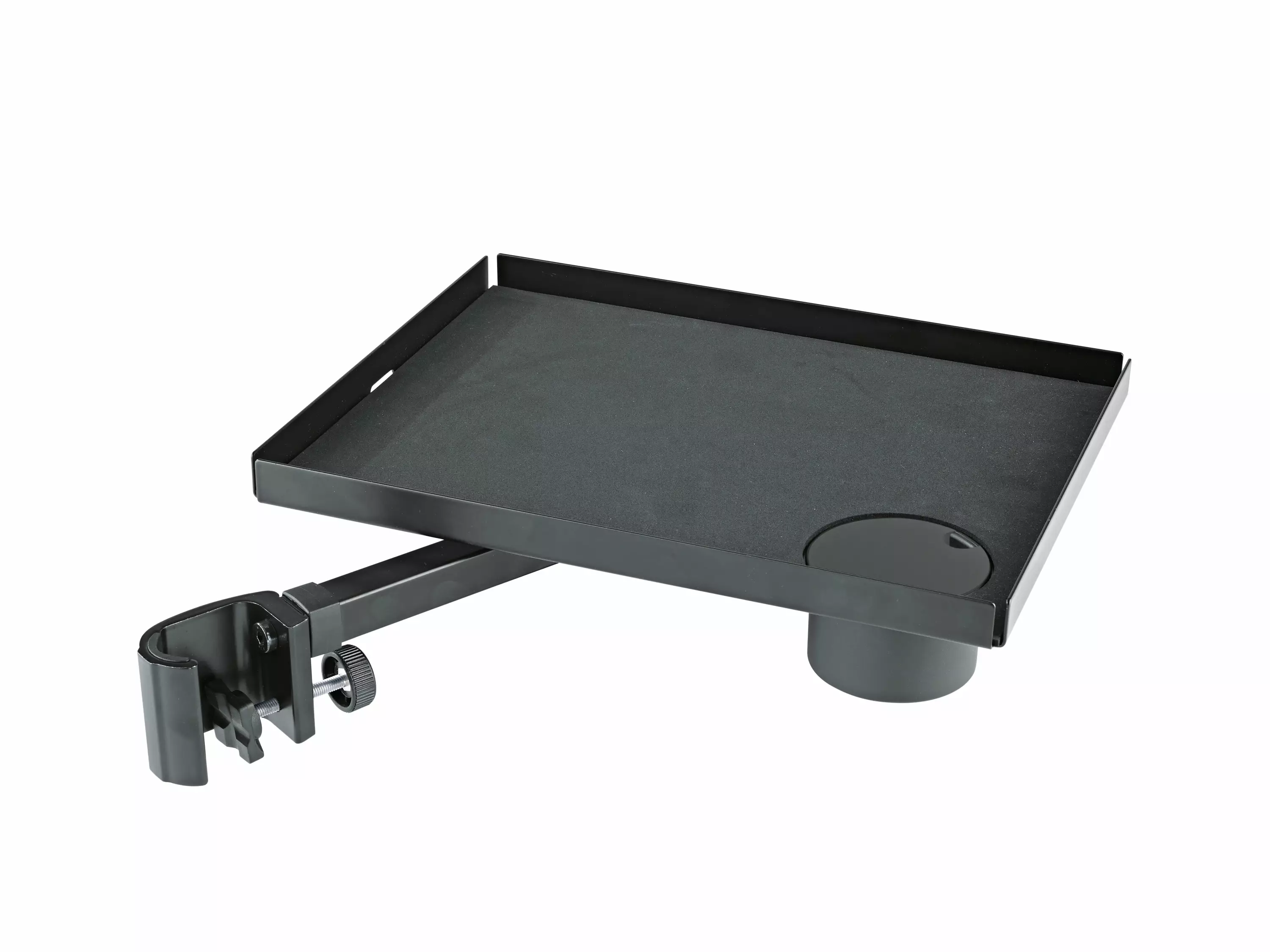 K&M 12225 lisätaso kiinnittyy kaikkiin jalustoihin, joiden putken halkaisija on enintään 30 mm. Käytettävissä oleva hyllytila on 250 x 330 mm, ja se on ihanteellinen pienemmille elektroniikkalaitteille, kuten miksereille, ohjaimille tai tableteille. Levyssä oleva lisäaukko takaa kätevän kaapelin reitityksen. Toinen hyödyllinen ominaisuus on tölkki-/kuppiteline. Tukeva teräsrakenne sopii myös lyömäsoittimien ja muiden musiikkitarvikkeiden säilytykseen. Vaahtomuovinen insertti vaimentaa tärinää ja estää epämiellyttävät taustaäänet. Lisäksi etäisyyttä jalustaan sekä levyn linjausta voidaan säätää yksilöllisesti.