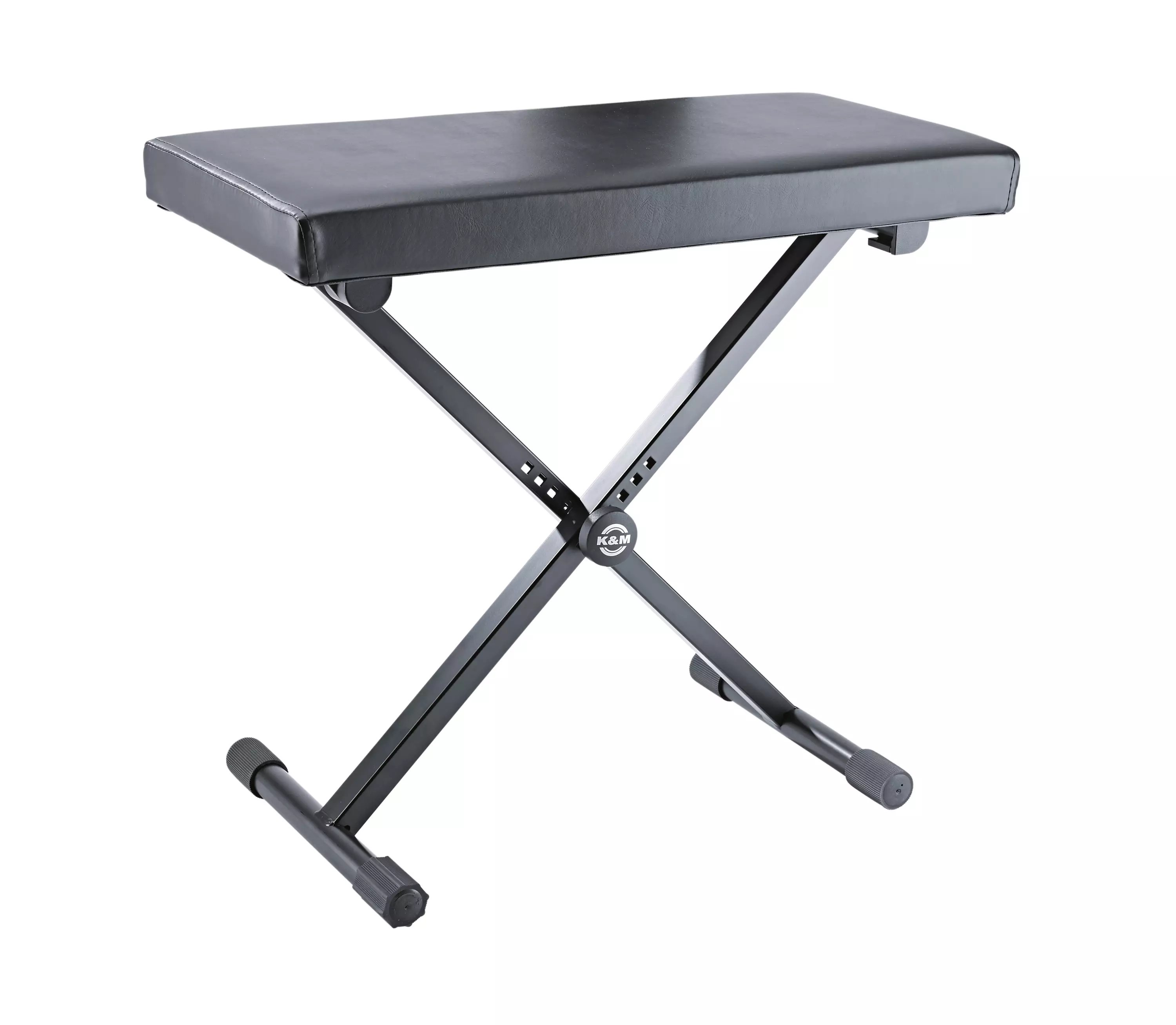 Extremely wide keyboard bench, sturdy tubular steel, height-adjustable, wobble-free design, collapsible for easy transport, black imitation leather or wear-resistant black fabric seat 650 x 300 mm.