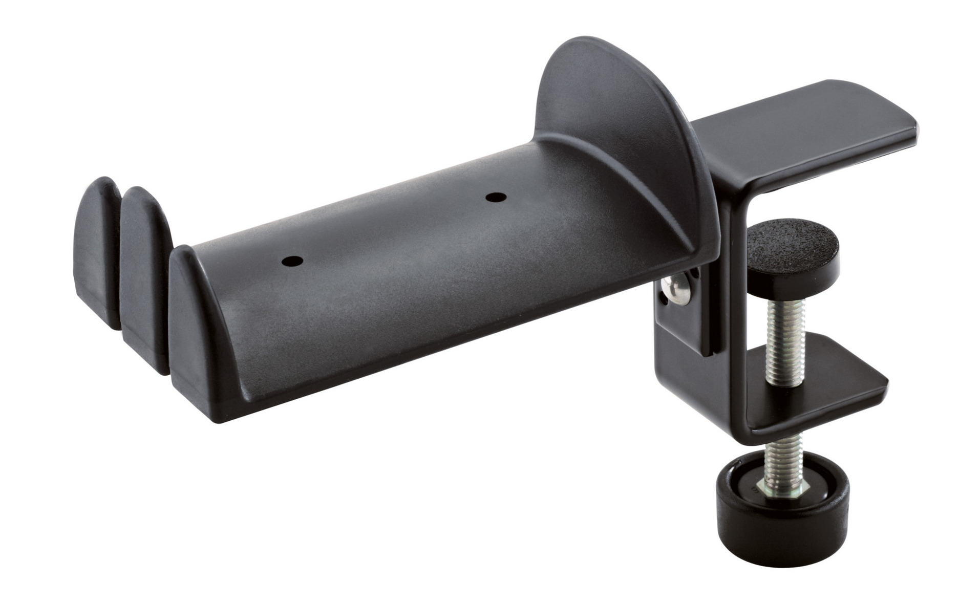 K&M 16090 pöytä/hylly/tasokiinnitteinen perusmallinen kuuloketeline sankakuulokkeille.