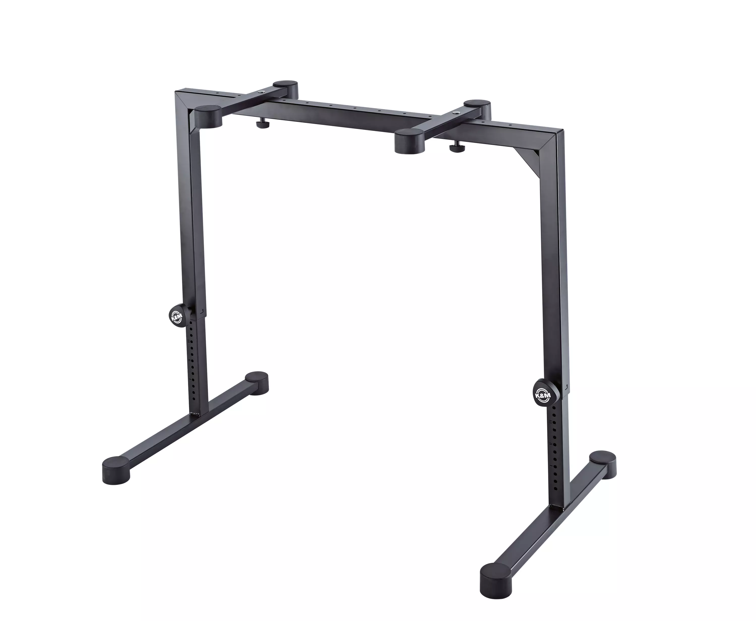 Kompakti teräsputkirakenne ja suuret pyöreät lattiasuojat tekevät tästä viehättävästä kosketinsoitintelineestä todella vakaan. Kaksipuoliset jousikuormitteiset lukitusruuvit tekevät tarkasta korkeudensäädöstä helppoa. Tukivarret voidaan säätää näppäimistön koon mukaan. Taitettuna pöytä mahtuu hyvin pieneen tilaan.