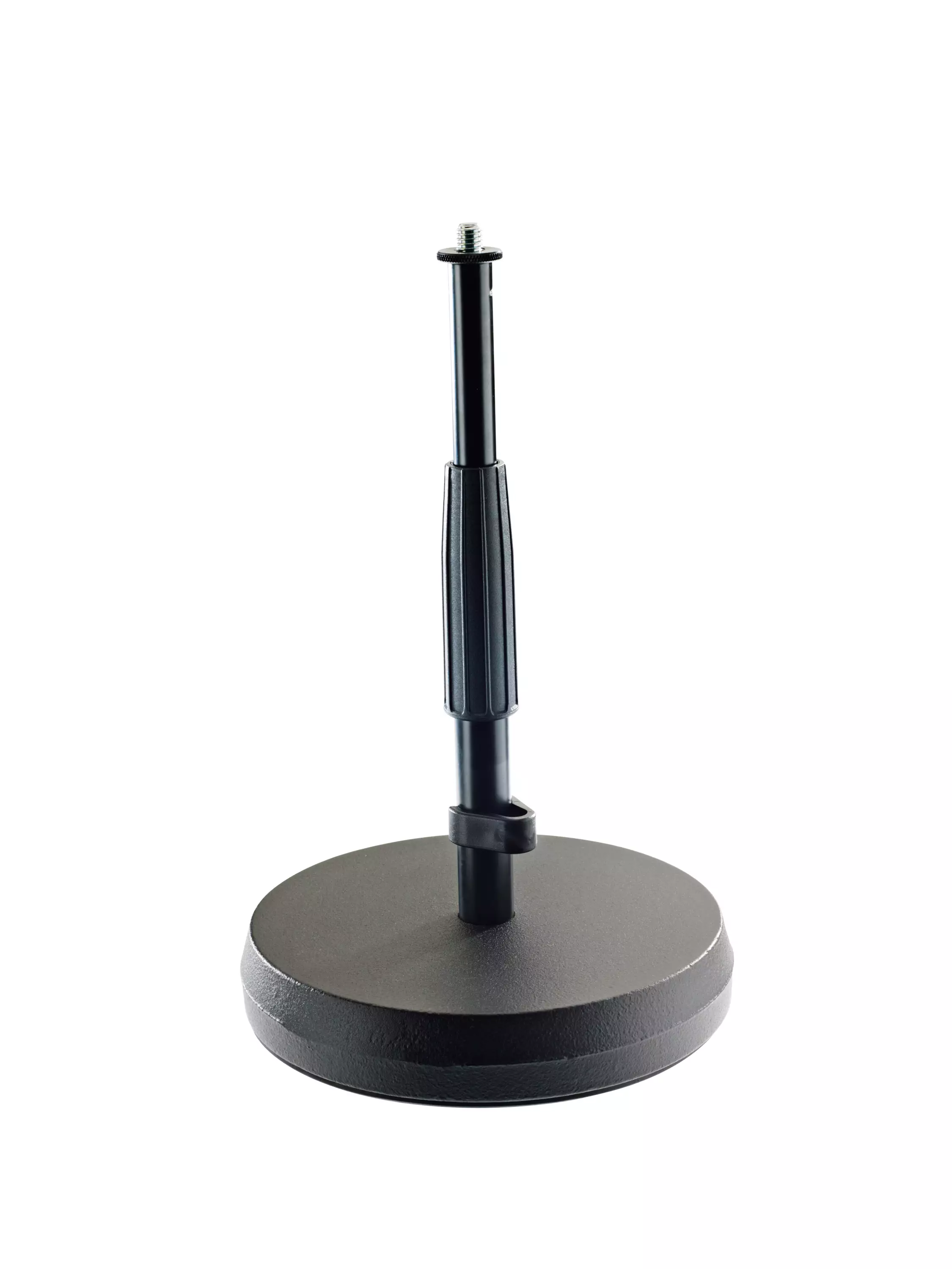 Matala ja jämäkkä pöytäjalusta mikille korkeussäädöllä ja resonanssiääniä vaimentavalla kumieristyksellä.