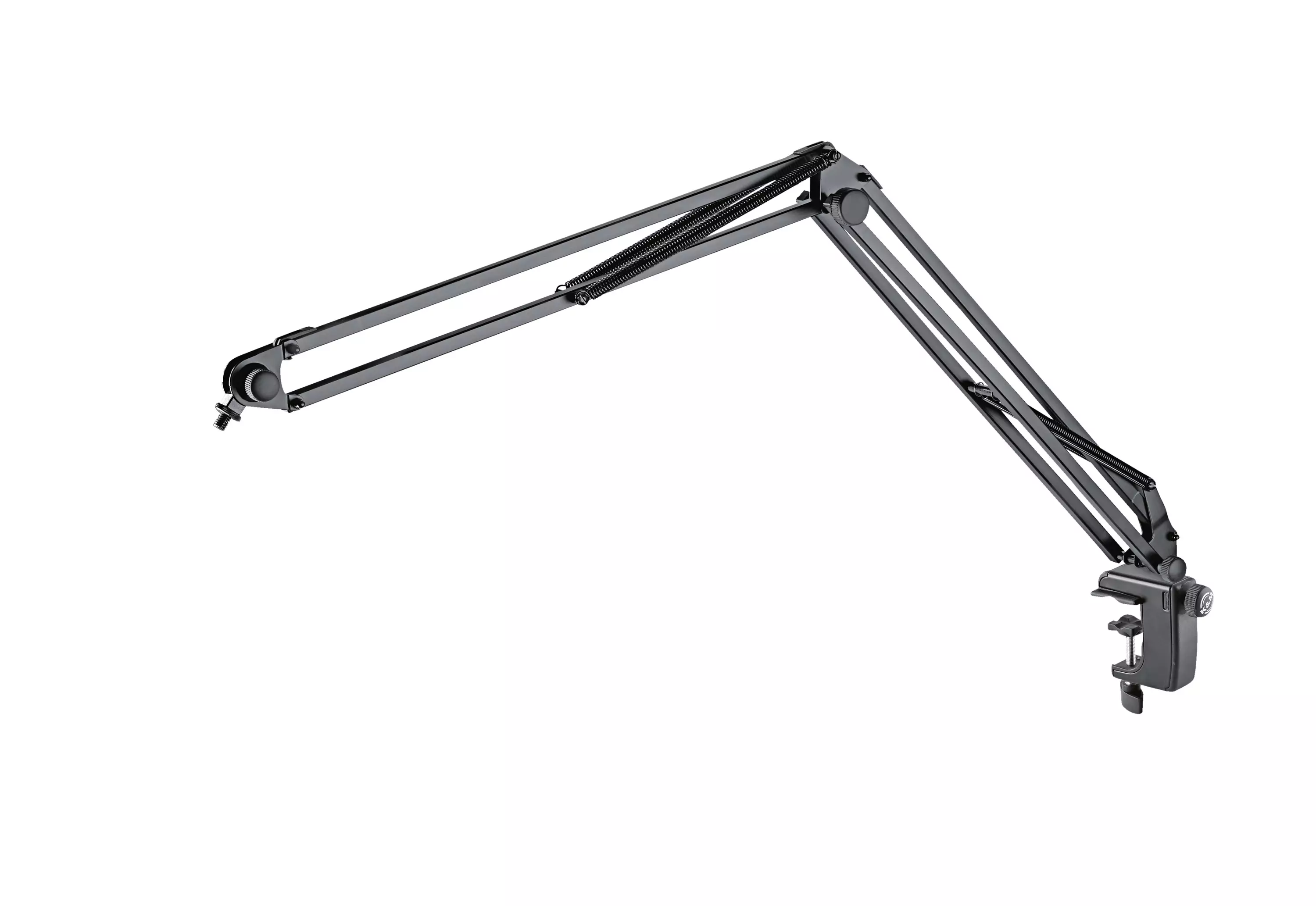 Flexible desktop microphone boom arm with 3/8" or 5/8" threaded connection for recording studios and multimedia workstations. Microphones, tablets or smartphones with a total weight of up to 0.8 kg can be easily and conveniently aligned and positioned. The microphone desk arm is supplied without cable and can therefore be equipped individually. Four useful cable clips are already included in the scope of delivery. With a clamping range from 10 to 51 mm / ø 15 to ø 51 mm, the clamp offers a wide range of mounting options. The sturdy metal frame with high-quality plastic inserts and non-slip support ensures secure and powerful clamping. Thanks to the specially shaped clamping surfaces, the clamp can be used on smooth surfaces as well as on round tubes. Optionally, the microphone boom arm can also be fixed with the additionally available table flange 23855.