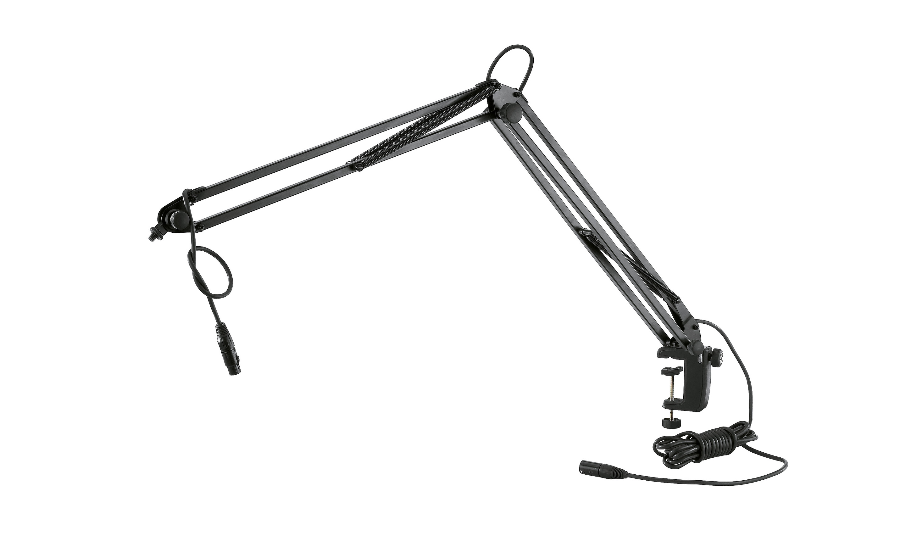Our popular, smooth-running microphone desk arm with 3/8" or 5/8" thread connector for sound studios and multimedia work stations with a new innovative table clamp. Easy to position and suitable for microphones to max. 0.8 kg. The 5 m long microphone cable with a 3 pin XLR plug connector is included in the delivery. Having a clamping range of 10 to 51 mm / ø 15 to ø 51 mm the clamp is suitable for a wide spectrum of mounting. The stable metal construction with high quality plastic inserts guarantees secure and strong hold. The cleverly shaped clamping parts allow the clamp to be used on smooth surfaces and round-shaped tubes. The microphone arm can also be fixed with the table flange 23855 available as an optional extra