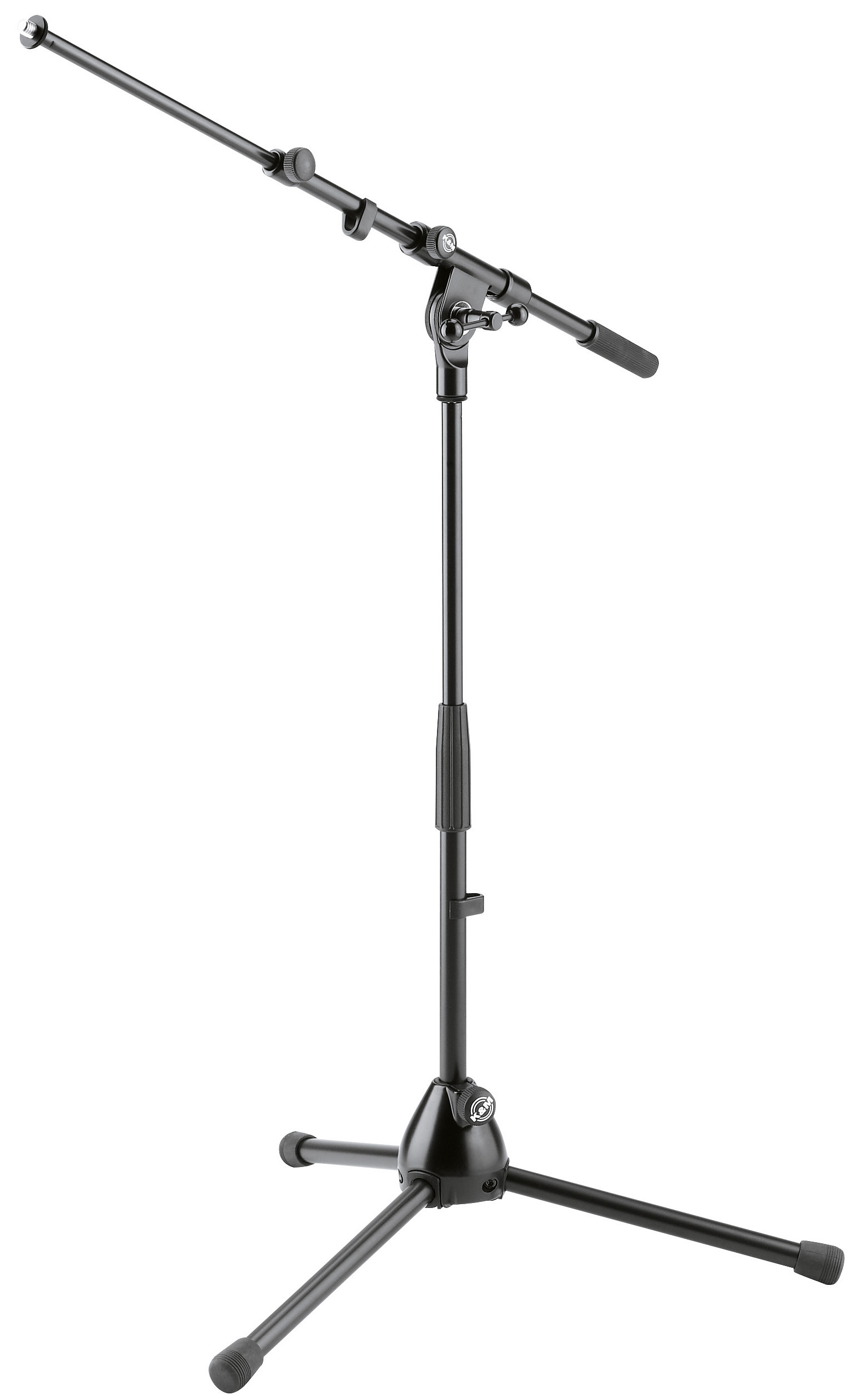 Low-level, telescopic stand with foldable legs. Comes with 2-piece boom arm.