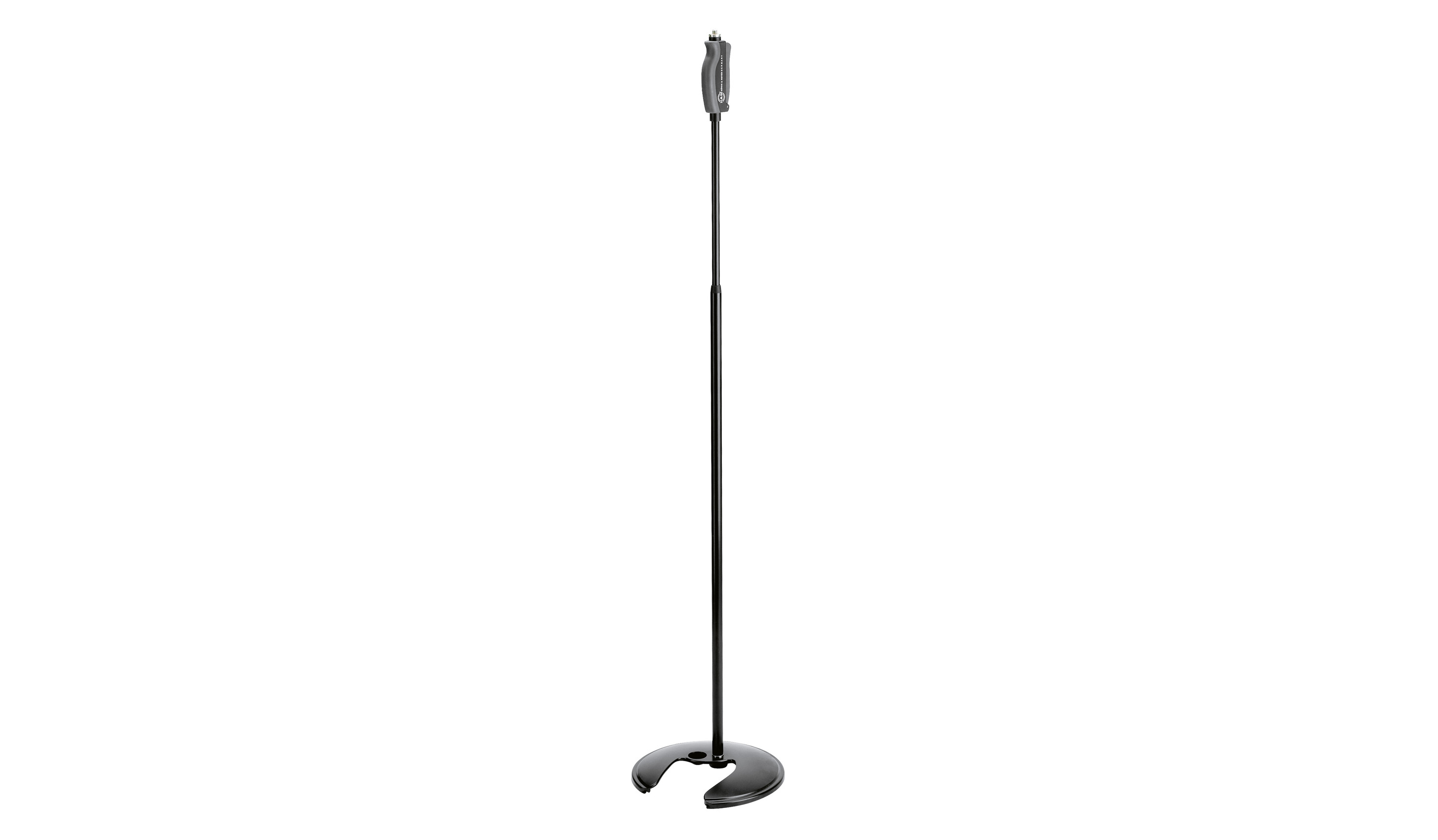 This model has a round, heavy cast-base with a cut-out design that allows for stacking of up to 5 microphone stands. It has the unique Soft-Touch one-hand clutch which allows height to be adjusted with a quick squeeze to easily raise and lower the mic.