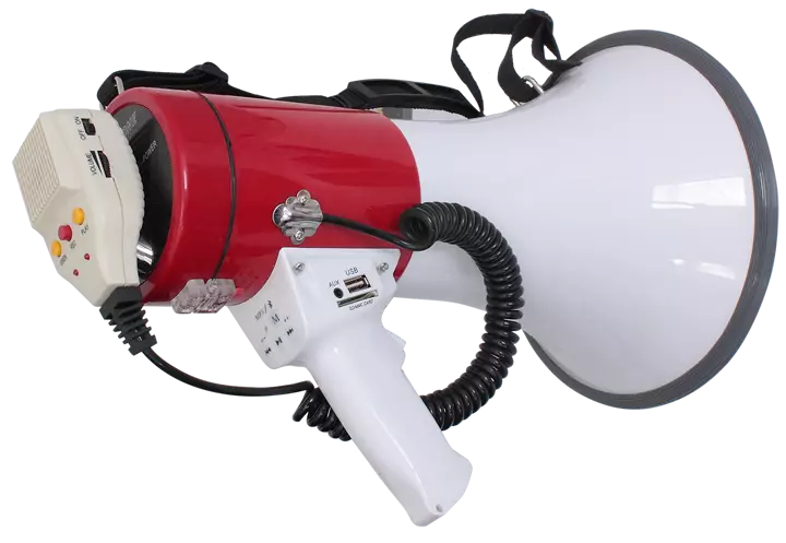 Tehokas 50 watin teholla ja kädessä pidettävällä mikorofonilla varustetu megafoni sisä- ja ulkokäyttöön.