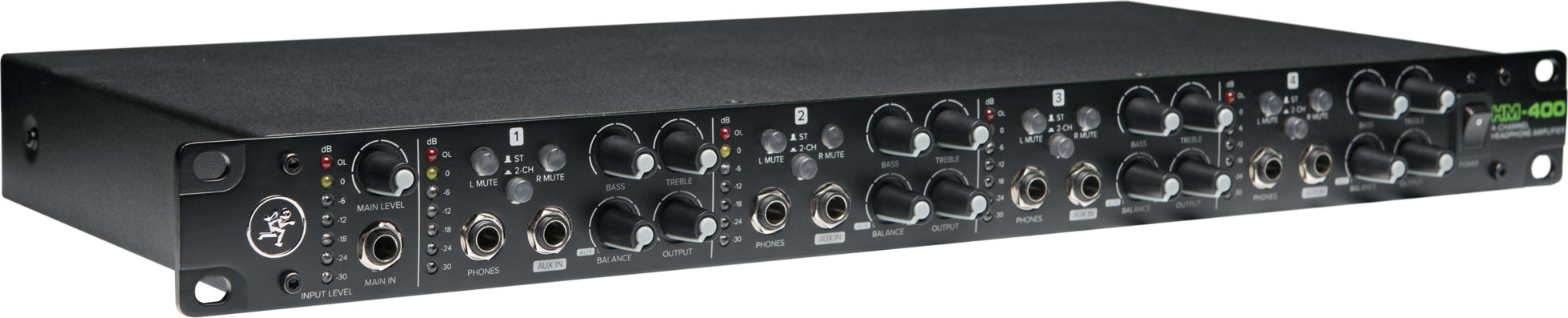 Kätevästi yhden 19" räkkiunitin kokoinen, lujatekoinen ja selkeä Mackie HM-400 tarjoaa analogisen ja dynamiikaltaan laajan vaihtoehdon eri tilanteisiin. Stereotulo on toteutettu sekä XLR että 6,3mm TRS-liittimin, 12 (neljä ryhmää, jokaisessa liitin kolmelle kuulokeparille) 6,3mm kuulokelähdön lisäksi laitteessa on myös päälähdöt sekä XLR että 6,3mm TRS-liittimin. Kokonaistasolle on oma säädin.