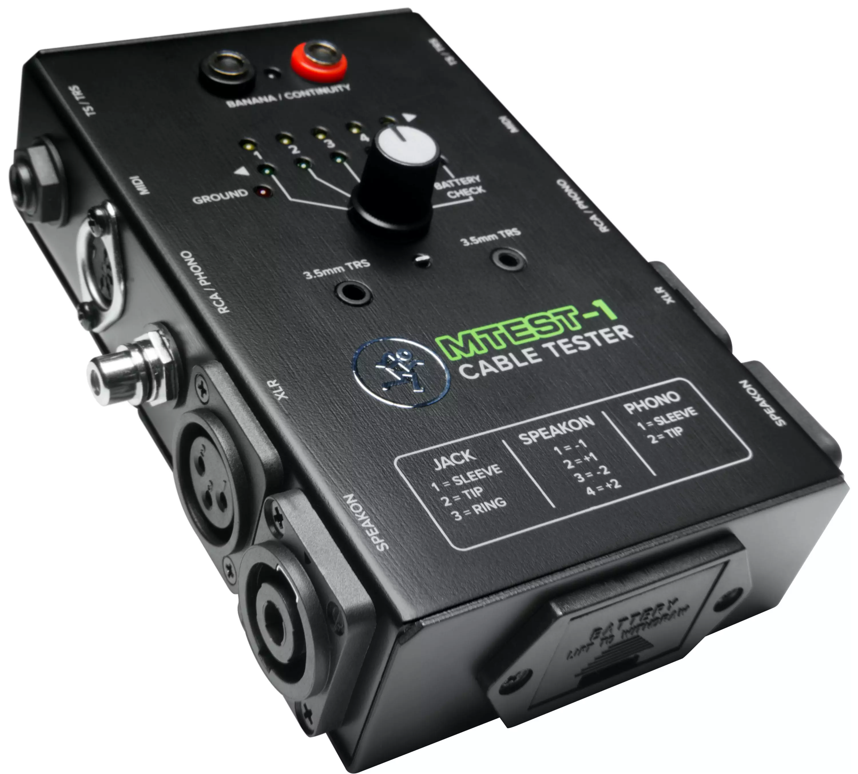 Mackie MTEST-1 -kaapelikoetin toimii yhdellä 9V paristolla ja hallitsee kaikki tavallisimmat liittimet kuten 6,3mm TRS, 6,3mm TS, XLR, RCA, Speakon, 3,5mm TRS, MIDI ja banaaniliittimet.