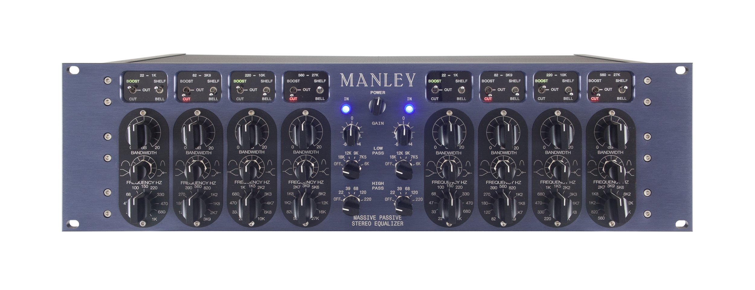 Creating natural, organic, acoustic tone can only be done with an equalizer that treats the signal with natural methods. The Massive Passive uses simple passive components and exploits their natural qualities rather than forcing a complex circuit to meet an arbitrary clinical or scientific goal. Manley knows that recording and mastering equalizers are used by artists for artistic goals and we balanced this design with a little more art than science. The Massive Passive is intended both for the most radical EQ sometimes needed for tracking as well as the most subtle shadings for vocals and mastering. It is designed to be a fundamentally different EQ but incorporates the best strengths of Pultecs, choice console EQs, parametrics and graphics. The difference is that the Massive allows twice as much EQ with half the coloration. It allows huge HF boosts without sibilance problems and unbelievable fatness without mud. This is unique. Being different also gives it some quirks and idiosyncrasies that will spark your creativity and sense of audio adventure. We could attempt to use dozens of superlatives to describe the sounds, but really, you have to experience it yourself. Words cannot do it justice. The astute reader will notice a lack of "buzz words" and that the Massive Passive is not built around gimmicks, plagiarisms, or conventional techniques. However, it is built to complement our Variable Mu® Limiter Compressor for instance... This combo could just be the ultimate processing chain. It's already a Mastering fave. To this end we finally have a new dedicated Mastering Version Massive Passive Stereo EQ available too.