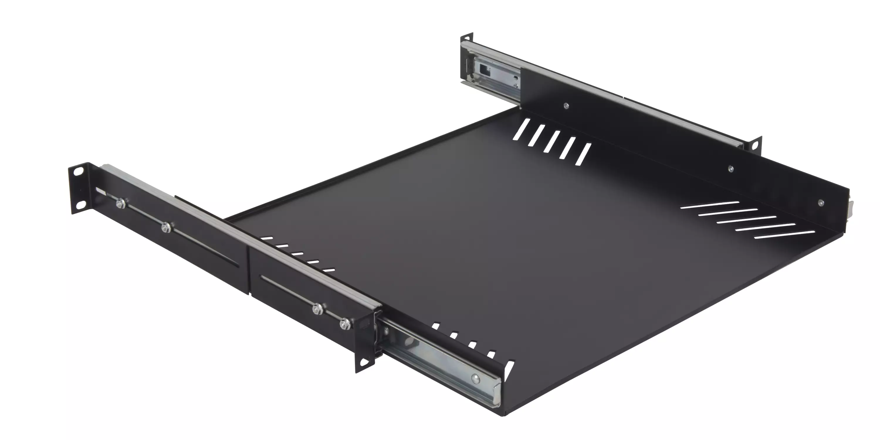 19” – 1U rackmount pull-out shelf made of steel sheets and fitted with galvanized side guides. Inner surface depth: 379 mm. Installation depth: min. 382 mm - 510 mm Max. Black finish.