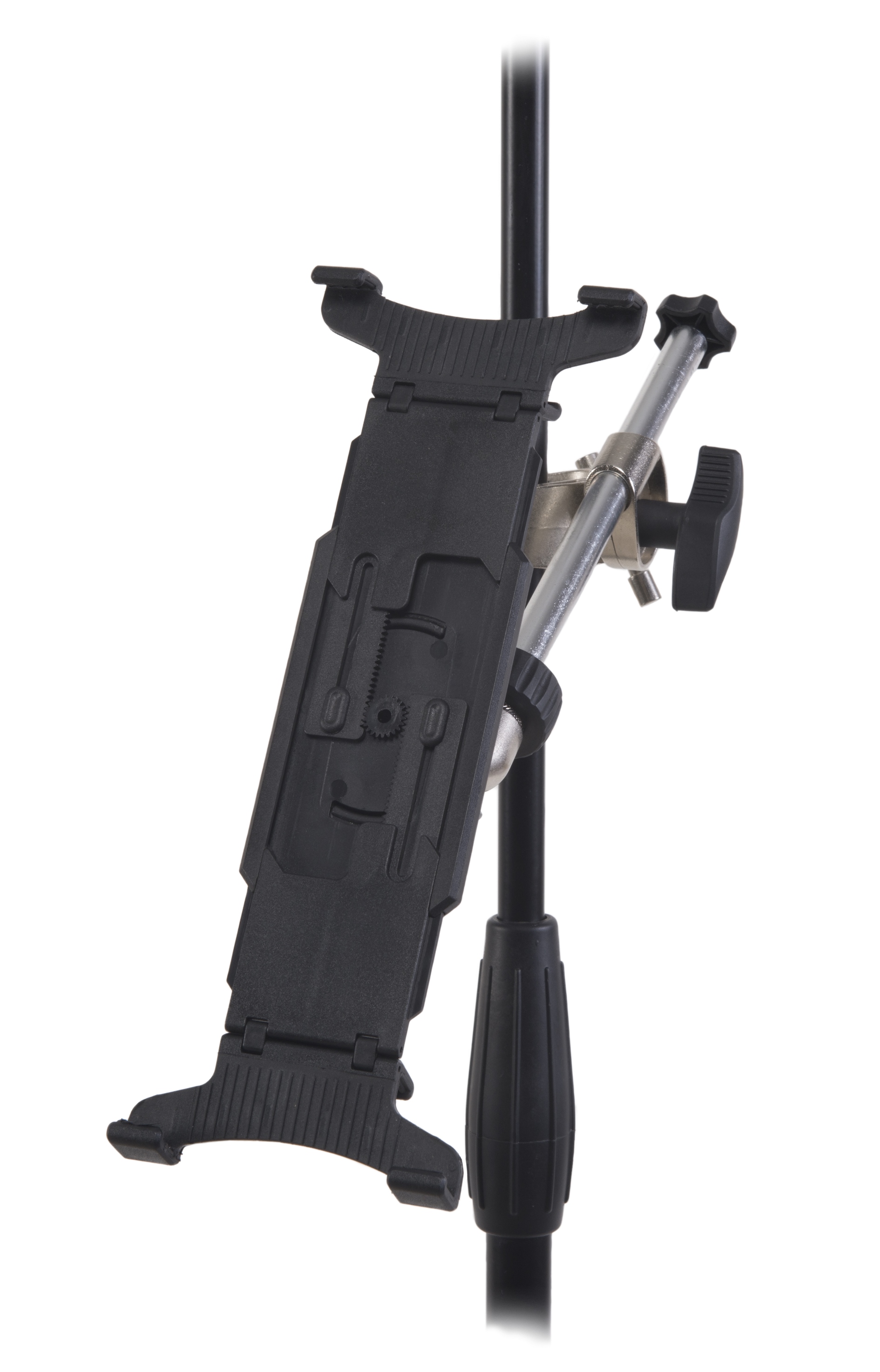 - Kätevä ja universaali älypuhelimen tai tabletin teline, joka voidaan kiinnittää mikrofonitelineisiin ja muihin telineisiin