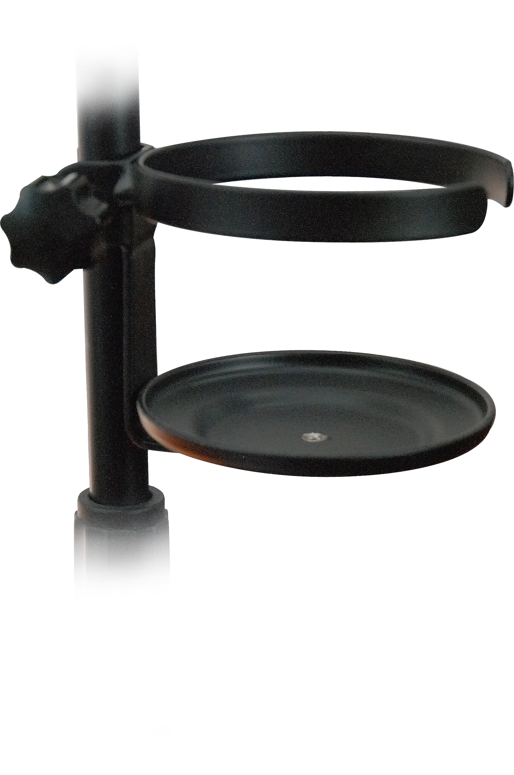 Universal holder for cans, glasses and bottles. Provided with universal clamp that allow it to be attached to microphone stands, music stands and instrument stands. Available in scratch-resistant matt black finish.