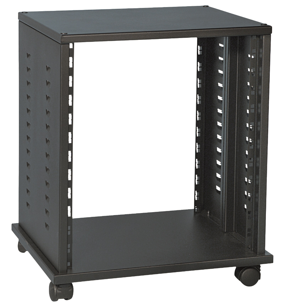 Professional steel construction standard 19” - 12U - rack stand.Featuring 4 swivel casters and 4 adjustable fixed feet. Equipped with “omega” inner reinforced bars that allow the accommodation of additional flaps to hold the equipments. 375 mm rackable depth. Ideal for stage, recording studios or home applications. Embossed black finish.