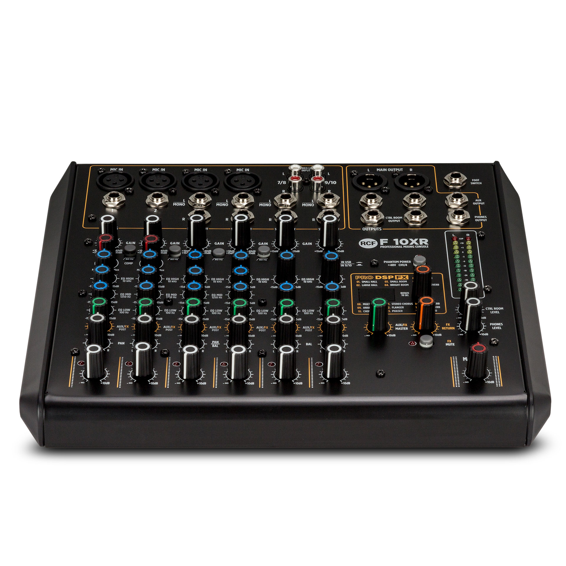 The F 10XR features 4 Mic Preamp Inputs, 2 Mono Line Inputs, 4 Stereo Line Inputs plus multi-FX and Recording via USB port, with balanced +28dB main output (Stereo XLR + TRS) and 2 single control compressors. The Mono channels are provided with 3-band EQ and Stereo with 2-band. The mixer features 16 PRO DSP internal FX presets and an Aux send (post fader) with rotary knob control.