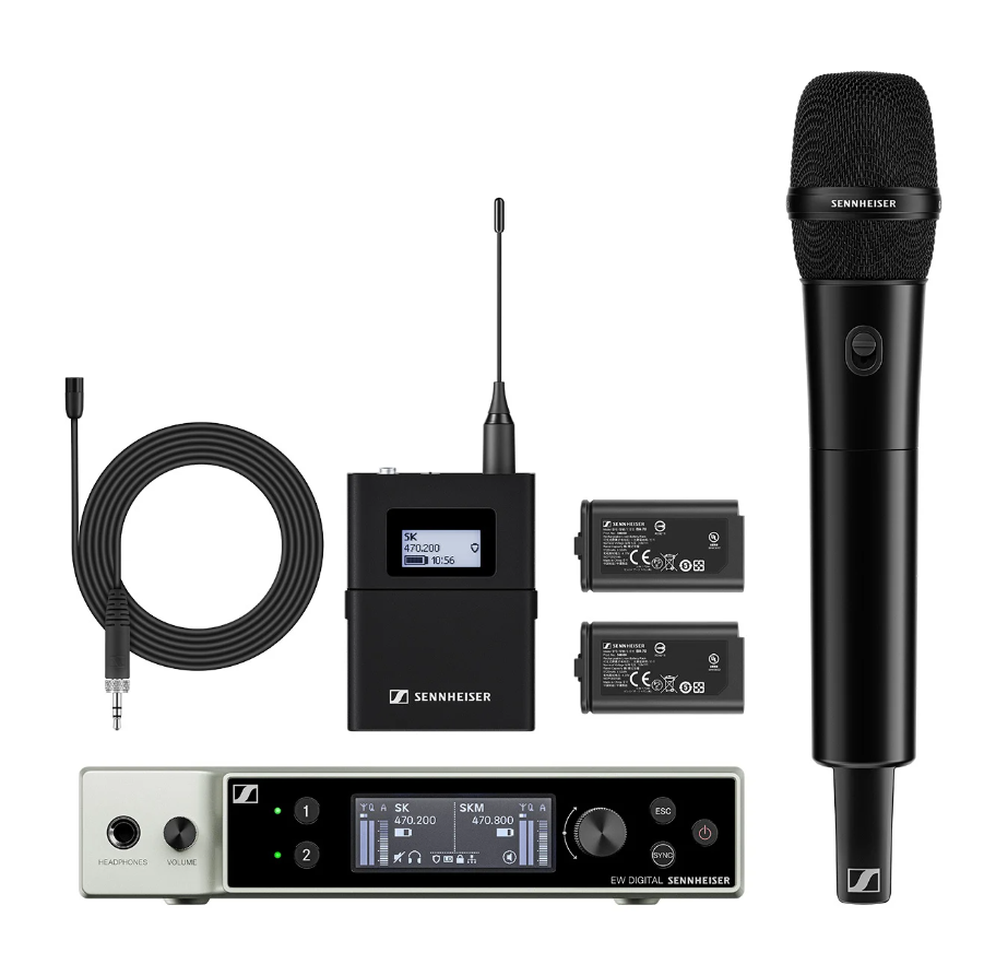 All-in-one-yhdistelmäsarja digitaalisiin langattomiin sovelluksiin, jossa on 2-kanavainen vastaanotin, käsilähetin ja body pack -lähetin, jossa on kiinnitettävä lavalier-mikrofoni.