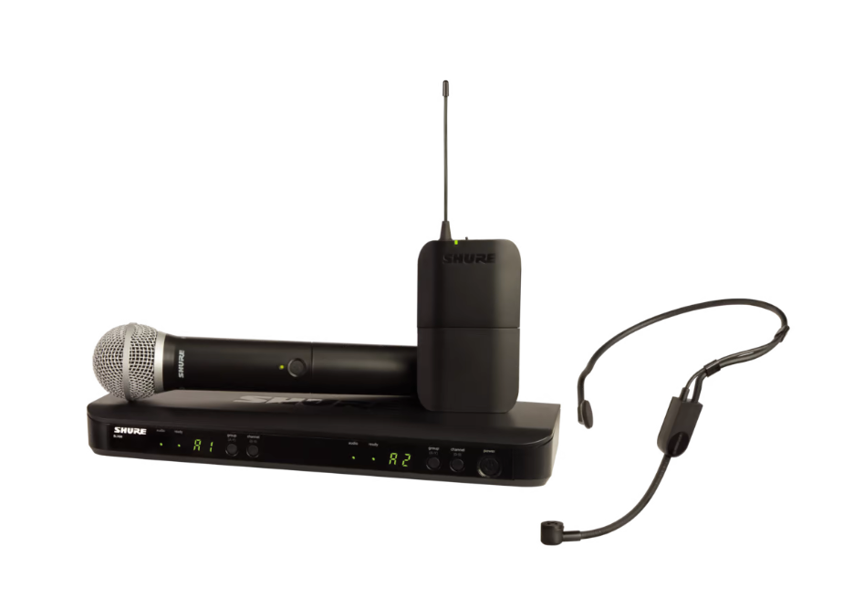 Shure langaton mikrofonijärjestelmä combo BLX1 taskulähettimellä, PGA1 pääpantamikrofonilla, BLX2/PG58 käsilähettimellä, sekä BLX88 vastaanottimella.