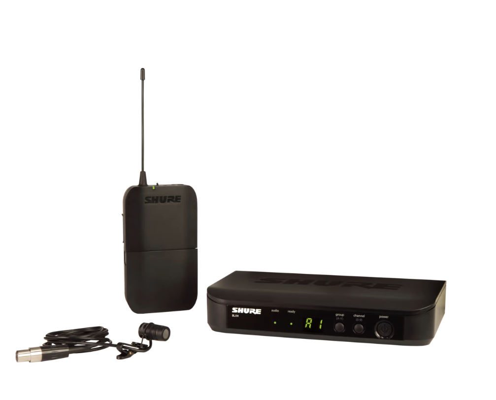 Shure langaton rintanappijärjestelmä BLX4 vastaanottimella, BLX1 vyölähettimellä, sekä WL185 rintanappimikrofonilla.