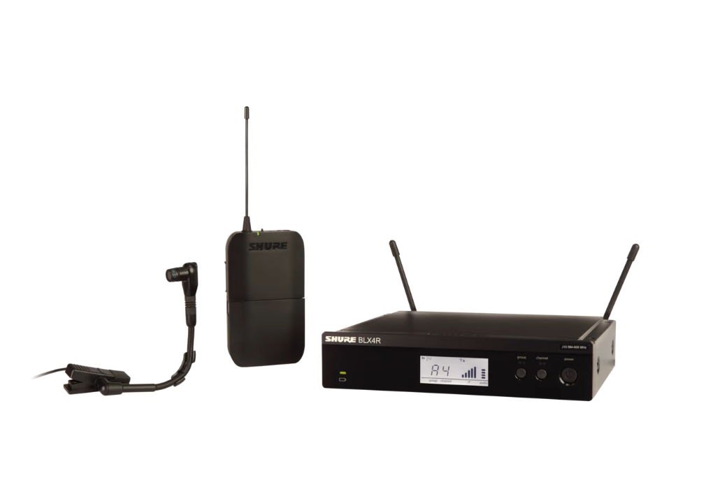 Shure langaton instrumenttijärjestelmä BLX1/Beta 98H/C vyölähettimellä ja instrumenttimikrofonilla, sekä BLX4R vastaanottimella.